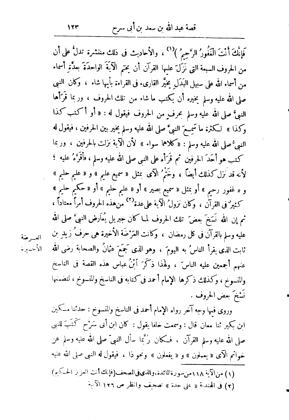 فَإِنَّكَ أَنْتَ الْغَفُورُ الرَّحِيمُ} والأحاديث في ذلك منتشرة تدل على أن من الحروف السبعة التي نزل عليها القرآن أن تختم الآية الواحدة بعدة أسماء من أسماء الله على سبيل البدل يخير القارئ في القراءة بأيها شاء وكان النبي صلى الله عليه وسلم يخيره أن يكتب ما شاء من تلك الحروف وربما قرأها النبي صلى الله عليه وسلم بحرف من الحروف فيقول له: "أو أكتب كذا وكذا" لكثرة ما سمع النبي صلى الله عليه وسلم يخير بين الحرفين فيقول له النبي صلى الله عليه وسلم: "نعم كلاهما سواء" لأن الآية نزلت بالحرفين وربما كتب هو أحد الحرفين ثم قرأه على النبي صلى الله عليه وسلم فأقره عليه لأنه قد نزل كذلك أيضا وختم الآي بمثل {سَمِيعٌ عَلِيمٌ} و {عَلِيمٌ حَكِيمٌ} و {غَفُورٌ رَحِيمٌ} أو بمثل {سَمِيعٌ بَصِيرٌ} أو {عَلِيمٌ حَكِيمٌ} أو {عَلِيمٌ حَلِيمٌ} كثير في القرآن وكان نزول الآية على عدة من هذه الحروف أمرا معتادا ثم إن الله نسخ بعض تلك الحروف لما كان جبريل يعارض النبي صلى الله عليه وسلم بالقرأن في كل رمضان وكانت العرضة الأخيرة هي حرف زيد بن ثابت الذي يقرأ الناس به اليوم وهو الذي جمع عثمان والصحابة رضي الله عنهم أجمعين عليه الناس ولهذا ذكر ابن عباس هذه القصة في الناسخ والمنسوخ وكذلك ذكرها الإمام أحمد في كتابه الناسخ والمنسوخ لتضمنها نسخ بعض الحروف.