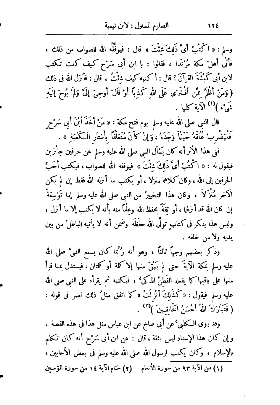 وسلم: "اكتب أي ذلك شئت" قال: فيوفقه الله للصواب من ذلك فأتى أهل مكة مرتدا فقالوا: يا ابن أبي سرح كيف كنت تكتب لابن أبي كبشة القرآن؟ قال: أكتبه كيف شئت قال: فأنزل الله في ذلك {وَمَنْ أَظْلَمُ مِمَّنِ افْتَرَى عَلَى اللَّهِ كَذِباً أَوْ قَالَ أُوحِيَ إِلَيَّ وَلَمْ يُوحَ إِلَيْهِ شَيْءٌ} الآية كلها.