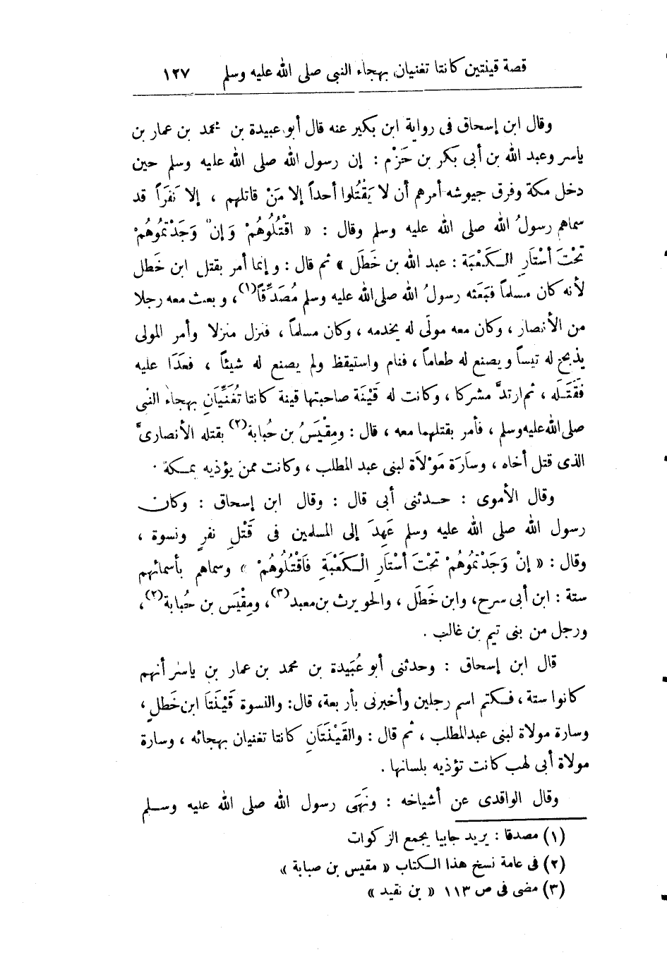 قال ابن إسحاق: وحدثني أبو عبيدة بن محمد بن عمار بن ياسر أنهم كانوا ستة فكتم اسم رجلين وأخبرني بأربعة قال: والنسوة قنيتا ابن خطل وسارة مولاة لبني عبد المطلب ثم قال: والقينتان كانتا تغنيان بهجائه وسارة مولاة أبي لهب كانت تؤذيه بلسانها.