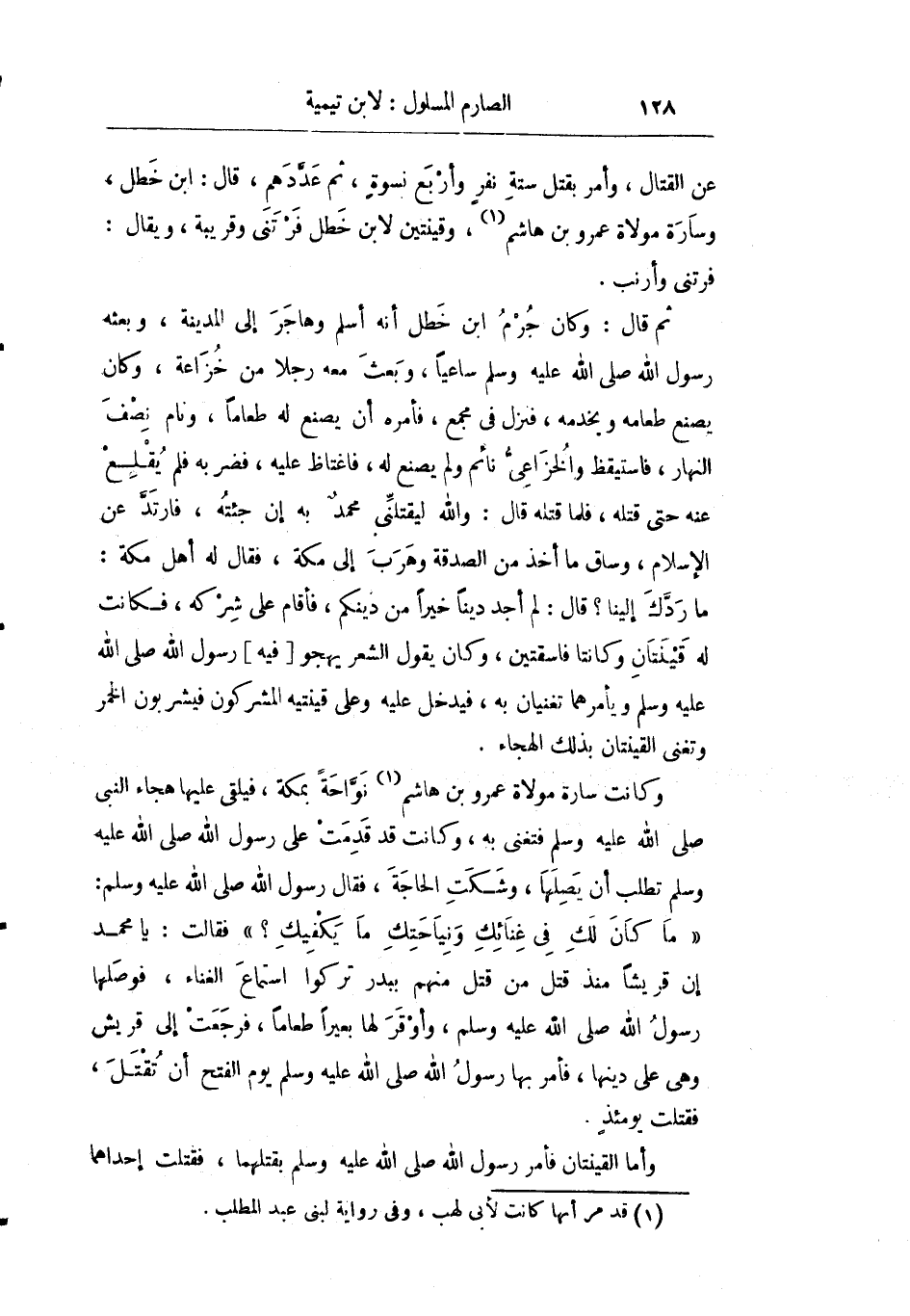 وكانت سارة مولاة عمرو بن هاشم مغنية نواحة بمكة فيلقى عليها هجاء النبي صلى الله عليه وسلم فتغني به وكانت قد قدمت على رسول الله صلى الله عليه وسلم تطلب أن يصلها وشكت الحاجة فقال رسول الله صلى الله عليه وسلم: "ما كان لك في غنائك ونياحتك ما يكفيك؟ " فقالت: يا محمد إن قريشا منذ قتل من قتل منهم ببدر تركوا استماع الغناء فوصلها رسول الله صلى الله عليه وسلم وأوقر لها بعيرا طعاما فرجعت إلى قريش وهي على دينها فأمر بها رسول الله صلى الله عليه وسلم يوم الفتح أن تقتل فقتلت يومئذ.