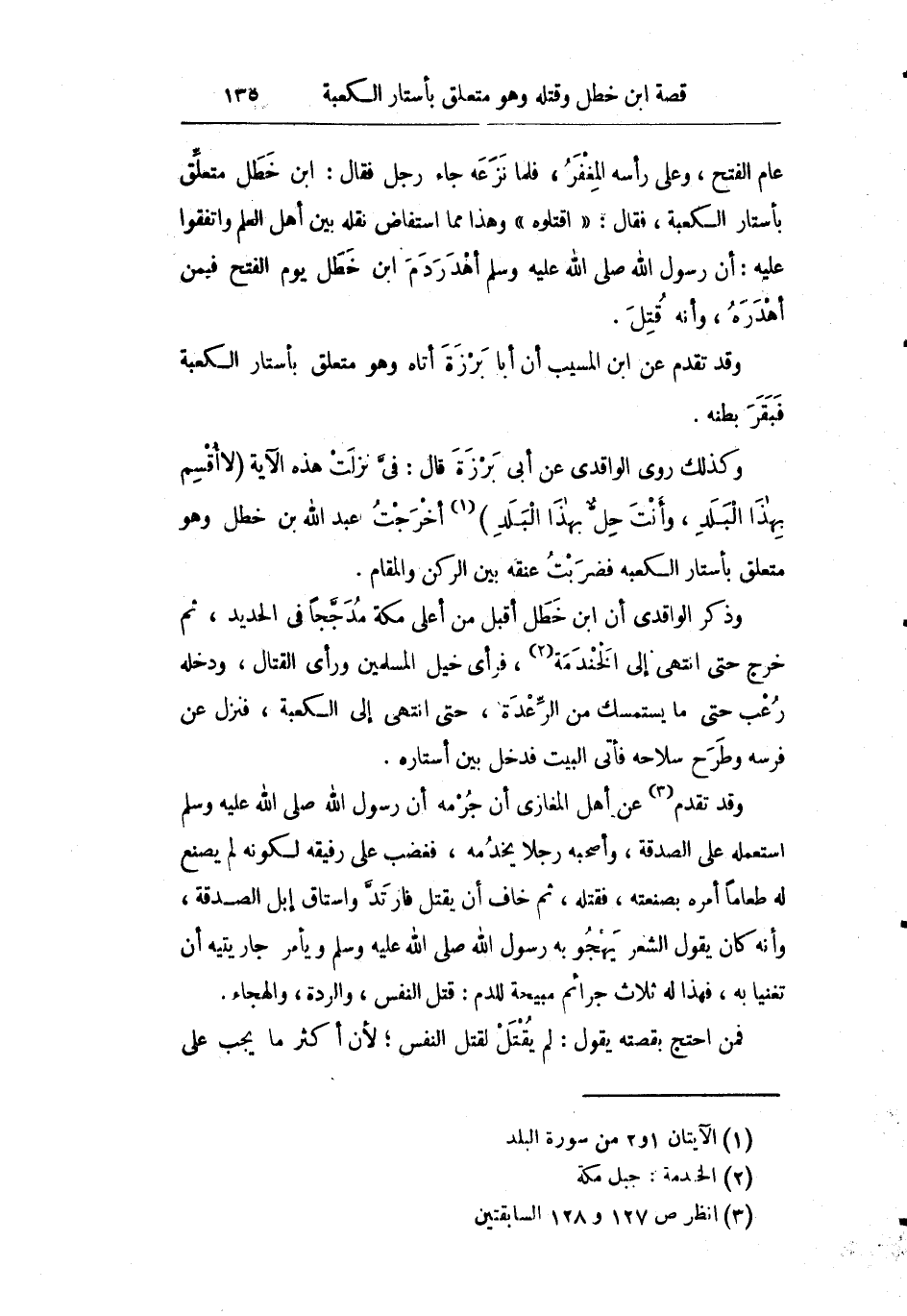 وكذلك روى الواقدي عن أبي برزة قال: فيّ نزلت هذه الآية: {لا أُقْسِمُ بِهَذَا الْبَلَدِ وَأَنْتَ حِلٌّ بِهَذَا الْبَلَدِ} أخرجت عبد الله بن خطل وهو متعلق بأستار الكعبة فضربت عنقه بين الركن والمقام.