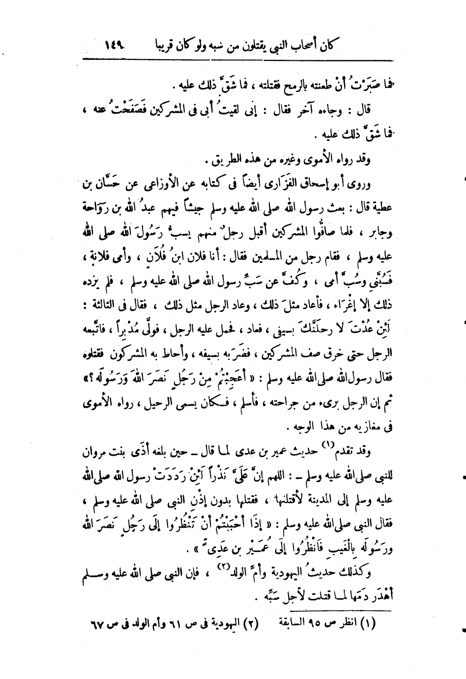 وقد تقدم حديث عمير بن عدي لما قال حين بلغه أذى بنت مروان للنبي صلى الله عليه وسلم: اللهم إن علي نذرا لئن رددت رسول الله صلى الله عليه وسلم إلى المدينة لأقتلنها فقتلها بدون إذن النبي صلى الله عليه وسلم فقال النبي صلى الله عليه وسلم: " إذا أحببتم أن تنظروا إلى رجل نصر الله ورسوله بالغيب فانظروا إلى عمير بن عدي ".