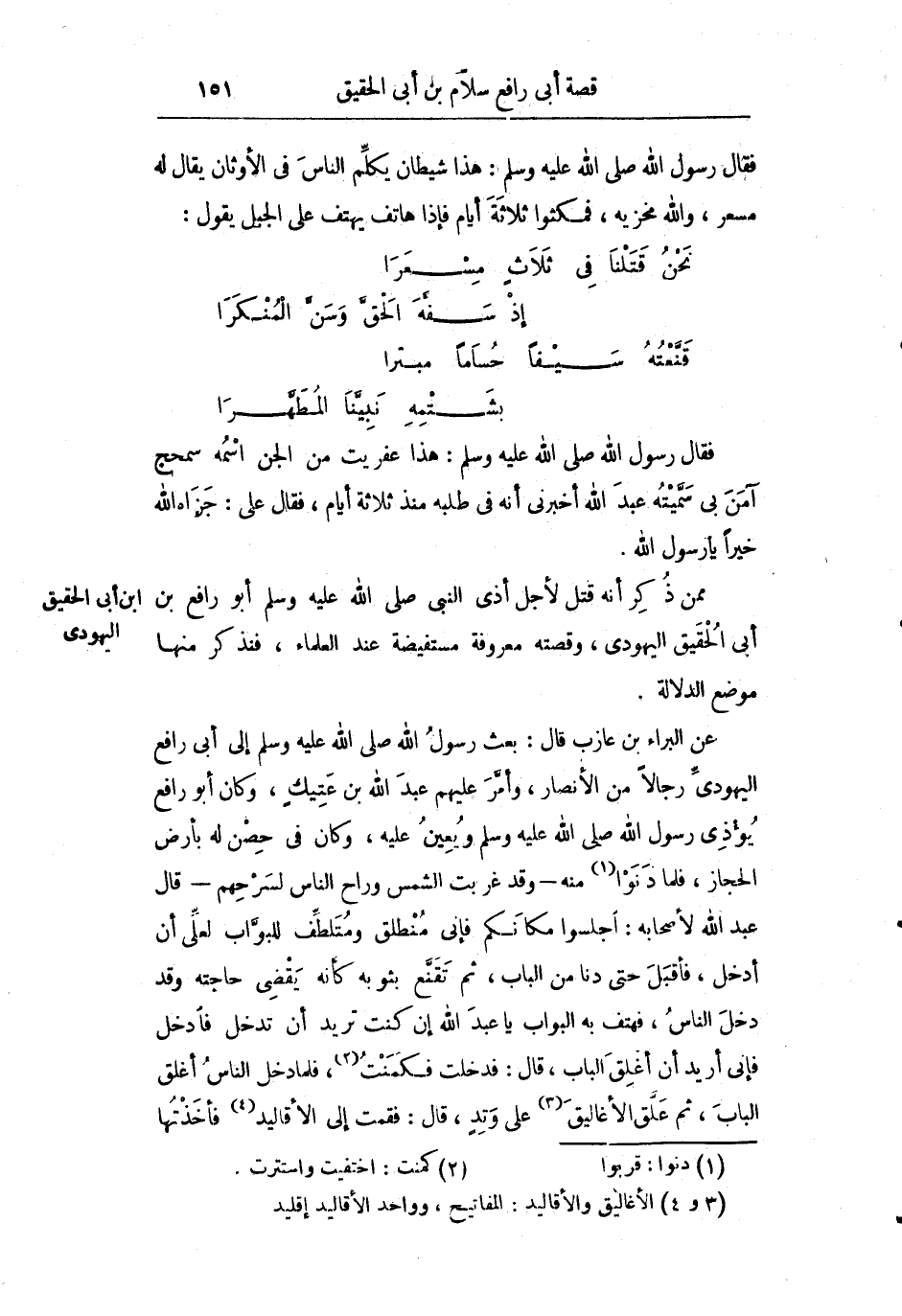 عن البراء بن عازب قال: "بعث رسول الله صلى الله عليه وسلم إلى أبي رافع اليهودي رجالا من الأنصار وأمر عليهم عبد الله بن عتيك وكان أبو رافع يؤذي رسول الله صلى الله عليه وسلم ويعين عليه وكان في حصن له بأرض الحجاز فلما دنوا منه وقد غربت الشمس وراح الناس بسرحهم قال عبد الله لأصحابه: اجلسوا مكانكم فإني منطلق ومتلطف للبواب لعلي أن أدخل فأقبل حتى دنا من الباب ثم تقنع بثوبه كأنه يقضي حاجته وقد دخل الناس فهتف به البواب يا عبد الله إن كنت تريد أن تدخل فادخل فإني أريد أن أغلق الباب قال: فدخلت فكمنت فلما دخل الناس أغلق الباب ثم علق الأغاليق على وتد قال: فقمت إلى الأقاليد فأخذتها