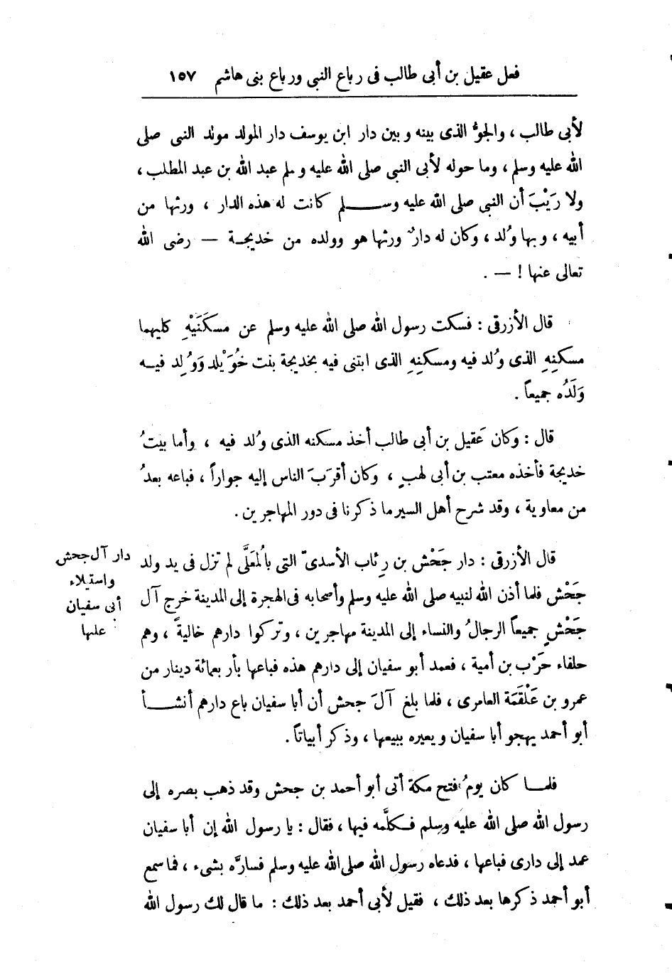 قال: وكان عقيل بن أبي طالب أخذ مسكنه الذي ولد فيه وأما بيت خديجة فأخذه معتب بن أبي لهب وكان أقرب الناس إليه جوارا فباعه بعد من معاوية وقد شرح أهل السير ما ذكرنا في دور المهاجرين.