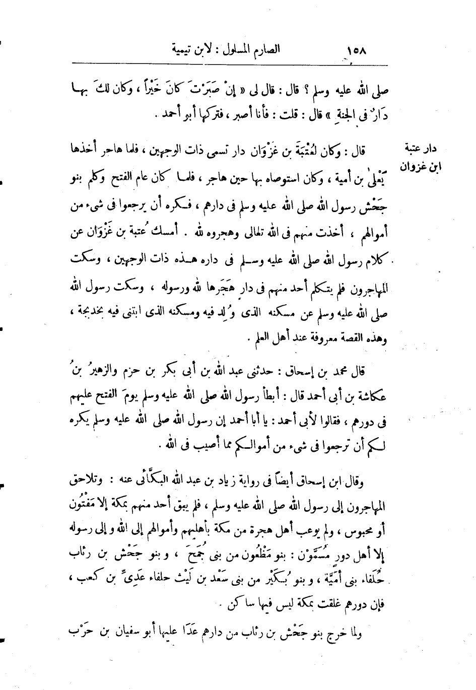قال: وكان لعتبة بن غزوان دار تسمى ذات الوجهين فلما هاجر أخذها يعلي بن أمية وكان استوصاه بها حين هاجر فلما كان عام الفتح وكلم بنو جحش رسول الله صلى الله عليه وسلم في دارهم فكره أن يرجعوا في شيء من أموالهم أخذت منهم في الله تعالى وهجروه لله أمسك عتبة بن غزوان عن كلام رسول الله صلى الله عليه وسلم في داره هذه ذات الوجهين وسكت المهاجرون فلم يتكلم أحد منهم في دار هجرها لله ورسوله وسكت رسول الله صلى الله عليه وسلم عن مسكنه الذي ولد فيه ومسكنه الذي ابتنى فيه بخديجة وهذه القصة معروفة عند أهل العلم.