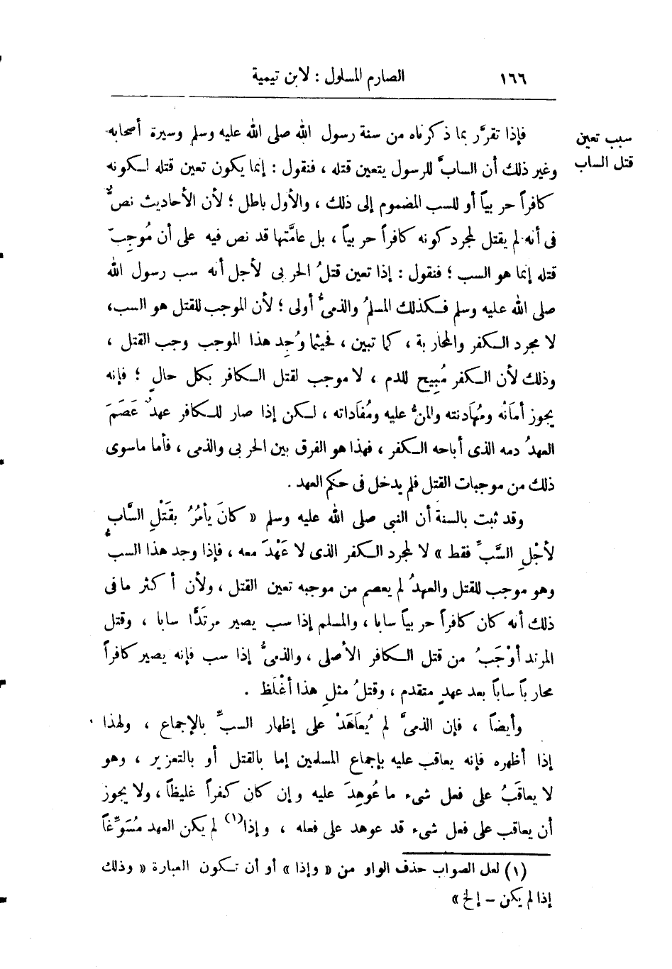 وقد ثبت بالسنة أن النبي صلى الله عليه وسلم "كان يأمر بقتل الساب لأجل السب فقط" لا لمجرد الكفر الذي لا عهد معه فإذا وجد هذا السب وهو موجب للقتل والعهد لم يعصم من موجبه تعين القتل ولأن أكثر ما في ذلك أنه كافر حربيا سابا والمسلم إذا سب يصير مرتدا سابا وقتل المرتد أوجب من قتل الكافر الأصلي والذمي إذا سب فإنه يصير كافرا محاربا سابا بعد عهد متقدم وقتل مثل هذا أغلظ.