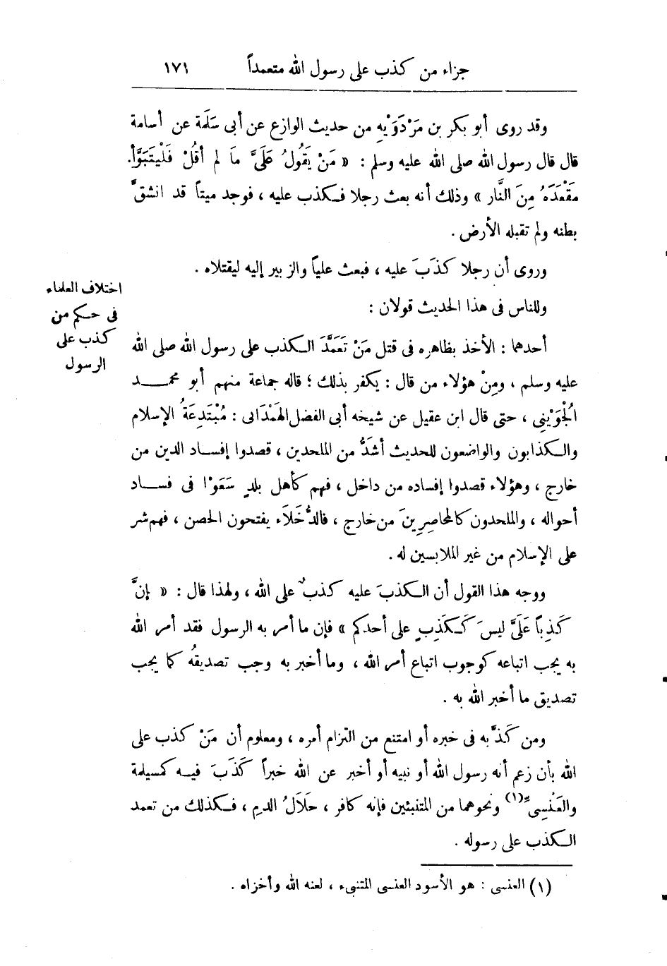 أحدهما: الأخذ بظاهره في قتل من تعمد الكذب على رسول الله صلى الله عليه وسلم ومن هؤلاء من قال: يكفر بذلك قاله جماعة منهم أبو محمد الجويني حتى قال ابن عقيل عن شيخه أبا الفضل الهمداني: "مبتدعة الإسلام والكذابون والواضعون للحديث أشد من الملحدين لأن الملحدين قصدوا إفساد الدين من خارج وهؤلاء قصدوا إفساده من داخل فهم كأهل بلد سعوا في فساد أحواله والملحدون كالمحاصربن من خارج فالدخلاء يفتحون الحصن فهم شر على الإسلام من غير الملابسين له".