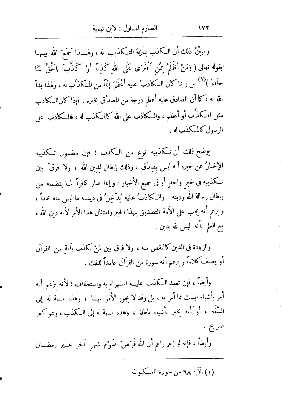 يوضح ذلك أن تكذيبه نوع من الكذب فإن مضمون تكذيبه الإخبار عن خبره أنه ليس بصدق وذلك إبطال لدين الله ولا فرق بين تكذيبه في خبر واحد أو في جميع الأخبار وإنما صار كافرا لما يتضمنه من إبطال رسالة الله ودينه والكاذب عليه يدخل في دينه ما ليس منه عمدا ويزعم أنه يجب على الأمة التصديق بهذا الخبر وامتثال هذا الأمر لأنه دين الله مع العلم بأنه ليس لله بدين.