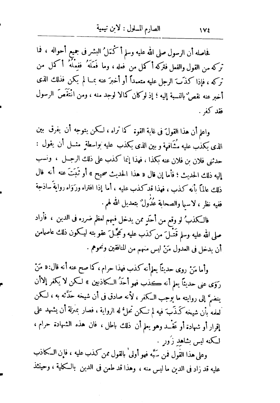 فحاصله أن الرسول صلى الله عليه وسلم أكمل البشر في جميع أحواله فما تركه من القول والفعل فتركه أكمل من فعله وما فعله ففعله أكمل من تركه فإذا كذب الرجل عليه متعمدا أو أخبر عنه بما لم يكن فذلك الذي أخبر عنه نقص بالنسبة إليه إذ لو كان كمالا لوجد منه ومن انتقص الرسول فقد كفر.