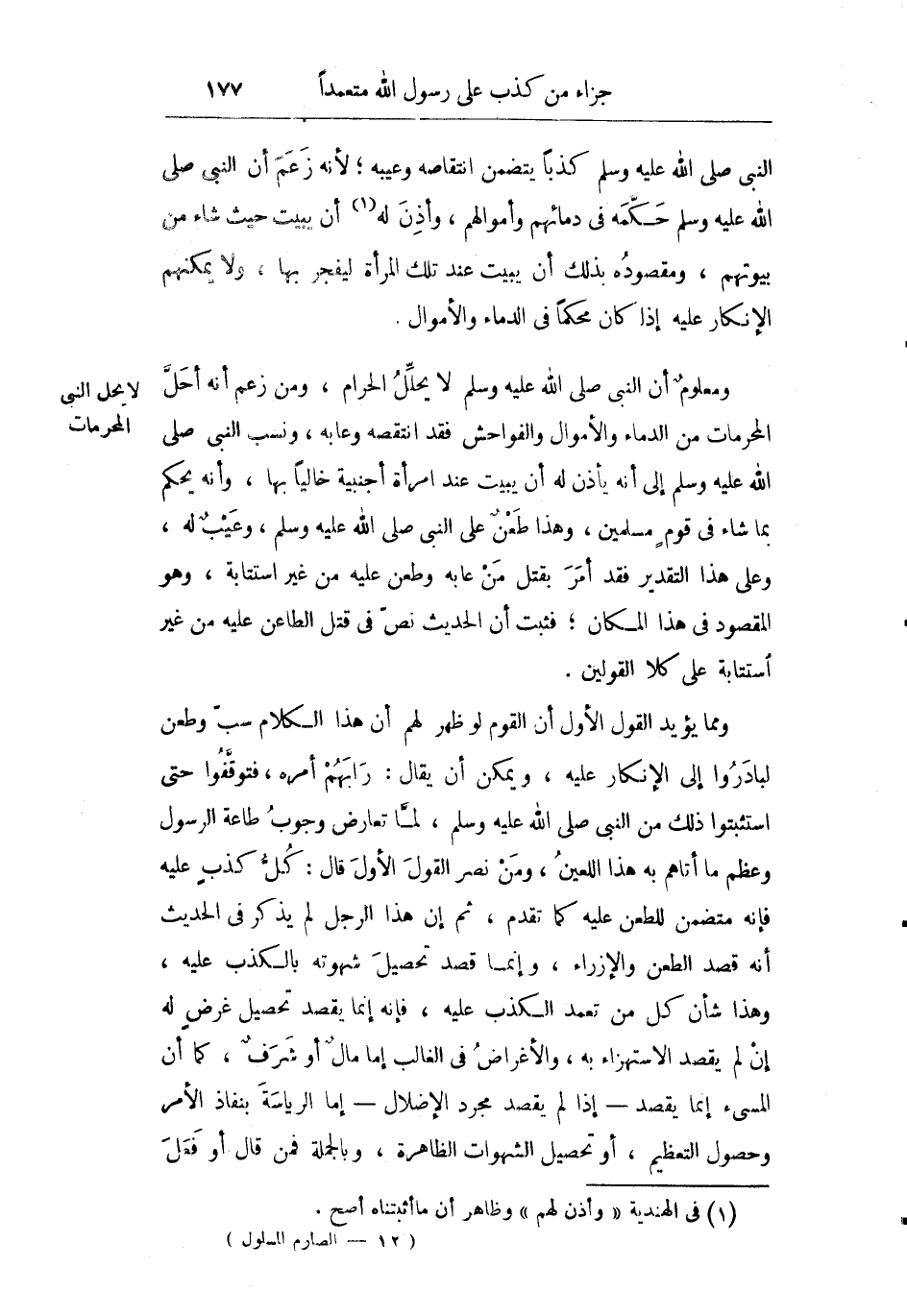 ومعلوم أن النبي صلى الله عليه وسلم لا يحلل الحرام ومن زعم أنه أحل المحرمات من الدماء والأموال والفواحش فقد انتقصه وعابه ونسب النبي صلى الله عليه وسلم إلى أنه يأذن له أن يبيت عند امرأة أجنبية خاليا بها وأنه يحكم بما شاء في قوم مسلمين وهذا طعن على النبي صلى الله عليه وسلم وعيب له وعلى هذا التقدير فقد أمر بقتل من عابه وطعن عليه من غير استتابة وهو المقصود في هذا المكان فثبت أن الحديث نص في قتل الطاعن عليه من غير استتابة على كلا القولين.