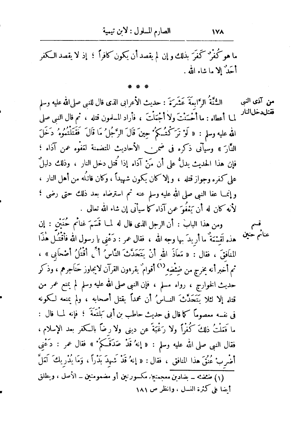 ومن هذا الباب: أن الرجل الذي قاله له لما قسم غنائم حنين: إن هذه لقسمة ما أريد بها وجه الله فقال عمر: "دعني يا رسول الله صلى الله عليه وسلم فأقتل هذا المنافق" فقال: " معاذ الله أن يتحدث الناس أني أقتل أصحابي " ثم أخبر أنه يخرج من ضئضه أقوام يقرؤون القرآن لا يجاوز حناجرهم وذكر حديث الخوارج رواه مسلم فإن النبي صلى الله عليه وسلم لم يمنع عمر من قتله إلا لئلا يتحدث الناس أن محمدا يقتل أصحابه ولم يمنعه لكونه في نفسه معصوما كما قال في حديث حاطب بن أبي بلتعة فإنه لما قال: "ما فعلت ذلك كفرا ولا رغبة عن ديني ولا رضا بالكفر بعد الإسلام" فقال النبي صلى الله عليه وسلم: " إنه قد صدقكم " فقال عمر: "دعني أضرب عنق هذا المنافق" فقال: " إنه قد شهد بدرا وما يدريك لعل