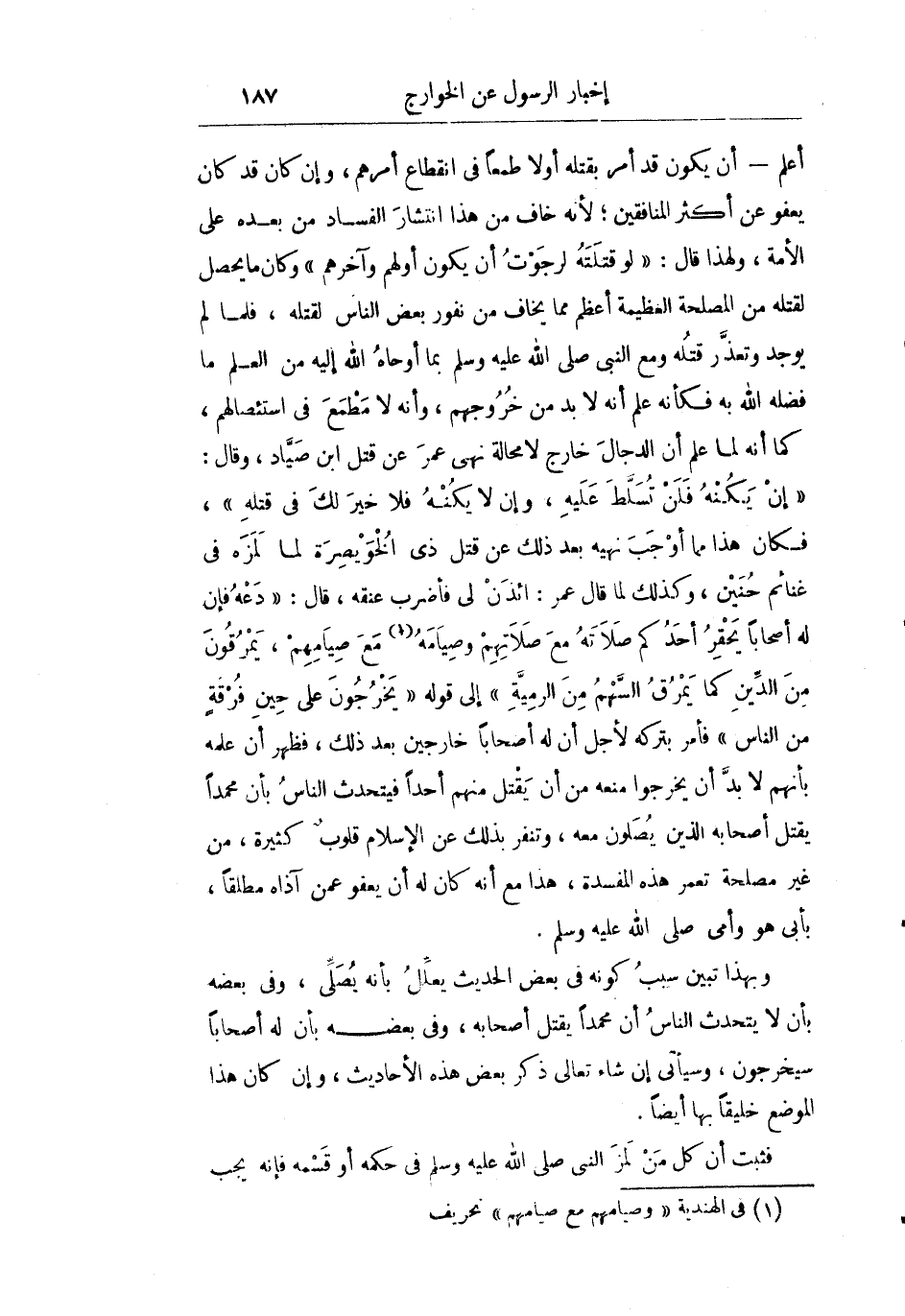 أعلم أن يكون أمر بقتله أولا طمعا في انقطاع أمرهم وإن كان قد كان يعفو عن أكثر المنافقين لأنه خاف من هذا انتشار الفساد من بعده على الأمة ولهذا قال: "لو قتلته لرجوت أن يكون أولهم وآخرهم" وكان ما يحصل لقتله من المصلحة العظيمة أعظم مما يخاف من نفور بعض الناس بقتله فلما لم يوجد وتعذر قتله ومع النبي صلى الله عليه وسلم بما أوحاه الله إليه من العلم ما فضله الله به فكأنه علم أنه لا بد من خروجهم أنه لا مطمع في استئصالهم كما أنه لما علم أن الدجال خارج لا محالة نهى عمر عن قتل ابن صياد وقال: "إن يكنه فلن تسلط عليه وإن لا يكنه فلا خير لك في قتله" فكان هذا مما أوجب نهيه بعد ذلك عن قتل ذي الخويصرة لما لمزه في غنائم حنين وكذلك لما قال عمر: "ائذن لي فاضرب عنقه" قال: "دعه فإن له أصحابا يحقر أحدكم صلاته مع صلاتهم وصيامه مع صيامهم يمرقون من الدين كما يمرق السهم من الرمية" إلى قوله: "يخرجون على حين فرقة من الناس " فأمر بتركه لأجل أن له أصحابا خارجين بعد ذلك فظهر أن علمه بأنهم لا بد أن يخرجوا منعه من أن يقتل منهم أحدا فيتحدث الناس بأن محمدا يقتل أصحابه الذين يصلون معه وتنفر بذلك عن الإسلام قلوب كثيرة من غير مصلحة تعمر هذه المفسدة هذا مع أنه كان له أن يعفو عمن آذاه مطلقا بأبي هو وأمي صلى الله عليه وسلم.