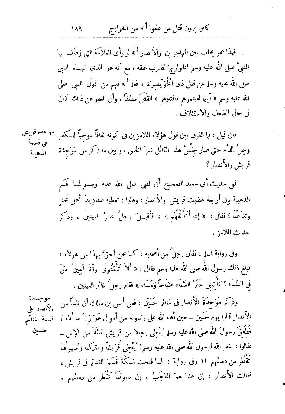 فهذا عمر يحالف بين المهاجرين والأنصار أنه لو رأى العلامة التي وصف بها النبي صلى الله عليه وسلم الخوارج لضرب عنقه مع أنه هو الذي نهاه النبي صلى الله عليه وسلم عن قتل ذي الخويصرة فعلم أنه فهم من قول النبي صلى الله عليه وسلم: "أينما لقيتموهم فاقتلوهم" القتل مطلقا وأن العفو عن ذلك كان في حال الضعف والاستئلاف.