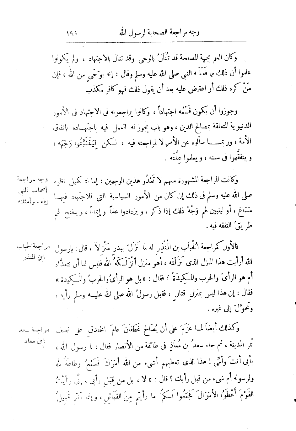 وكانت المراجعة المشهورة منهم لا تعدو هذين الوجهين: إما لتكميل نظره صلى الله عليه وسلم في ذلك إن كان من الأمور السياسة التي للاجتهاد فيها مساغ أو ليتبين لهم وجه ذلك إذا ذكر ويزدادوا علما وإيمانا وينفتح لهم طريق التفقه فيه.