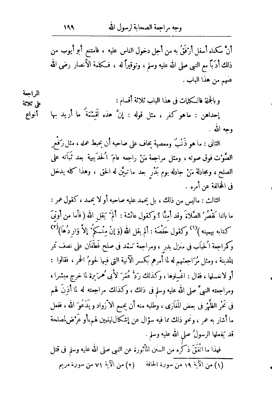 الثالث: ما ليس من ذلك بل يحمد عليه صاحبه أو لا يحمد كقول عمر: "ما بالنا نقصر الصلاة وقد أمنا؟ " وكقول عائشة: "ألم يقل الله: {فَأَمَّا مَنْ أُوتِيَ كِتَابَهُ بِيَمِينِه} " وكقول حفصة: "ألم يقل الله: {وَإِنْ مِنْكُمْ إِلاَّ وَارِدُهَا} " وكمراجعة الحباب في منزل بدر ومراجعة سعد في صلح غطفان على نصف تمر المدينة ومثل مراجعتهم له لما أمرهم بكسر الآنية التي فيها لحوم الحمر فقالوا: "أو لا نغسلها" فقال: "اغسلوها" وكذلك رد عمر لأبي هريرة لما خرج مبشرا ومراجعته للنبي صلى الله عليه وسلم في ذلك وكذلك مراجعته له لما أذن له في نحر الظهر في بعض المغازي وطلبه منه أن يجمع الأزواد ويدعو الله ففعل ما أشار به عمر ونحو ذلك مما فيه سؤال عن إشكال ليتبين لهم أو عرض لمصلحة قد يفعلها الرسول صلى الله عليه وسلم.