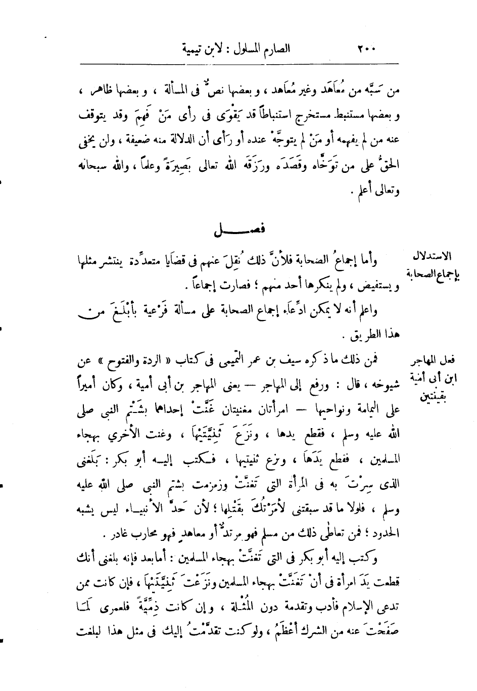 فمن ذلك ما ذكره سيف بن عمر التميمي في كتاب "الردة والفتوح" عن شيوخه قال: "ورفع إلى المهاجر يعني المهاجر بن أبي أمية وكان أميرا على اليمامة ونواحيها امرأتان مغنيتان غنت إحداهما بشتم النبي صلى الله عليه وسلم فقطع يدها ونزع ثنيتيها وغنت الأخرى بهجاء المسلمين فقطع يدها ونزع ثنيتيها فكتب إليه أبو بكر: بلغني الذي سرت به في المرأة التي تغنت وزمرت بشتم النبي صلى الله عليه وسلم فلولا ما قد سبقتني لأمرتك بقتلها لأن حد الأنبياء ليس يشبه الحدود فمن تعاطى ذلك من مسلم فهو مرتد أو معاهد فهو محارب غادر".