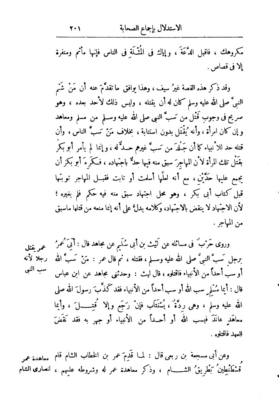 وروى حرب في مسائله عن ليث بن أبي سليم عن مجاهد قال: أتي عمر برجل سب النبي صلى الله عليه وسلم فقتله ثم قال عمر: "من سب الله أو سب أحدا من الأنبياء فاقتلوه" قال ليث: وحدثني مجاهد عن ابن عباس قال: "أيما مسلم سب الله أو سب أحدا من الأنبياء فقد كذب برسول الله صلى الله عليه وسلم وهي ردة يستتاب فإن رجع وإلا قتل وأيما معاهد عاند فسب الله أو سب أحدا من الأنبياء أو جهر به فقد نقض العهد فاقتلوه".