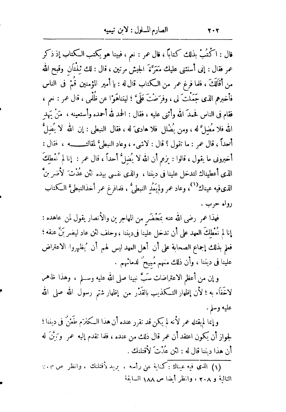 قال: اكتب بذلك كتابا قال عمر: نعم فبينما هو يكتب الكتاب إذ ذكر عمر فقال: إني استثني عليك معرة الجيش مرتين قال: لك ثنتان وقبح الله من أقالك فلما فرغ عمر من الكتاب قال له: يا أمير المؤمنين قم في الناس فأخبرهم الذي جعلت لي وفرضت علي ليتناهوا عن ظلمي قال عمر: نعم فقام في الناس فحمد الله وأثنى عليه فقال: الحمد لله أحمده وأستعينه من يهد الله فلا مضل له ومن يضلل فلا هادي له فقال النبطي: إن الله لا يضل أحدا فقال عمر: ما يقول؟ قال: لا شيء وعاد النبطي لمقالته فقال: أخبروني ما يقول قالوا: يزعم أن الله لا يضل أحدا قال عمر: إنا لم نعطك الذي أعطيناك لتدخل علينا في ديننا والذي نفسي بيده لئن عدت لأضربن الذي فيه عيناك وعاد عمر ولم يعد النبطي فلما فرغ عمر أخذ النبطي الكتاب" رواه حرب.