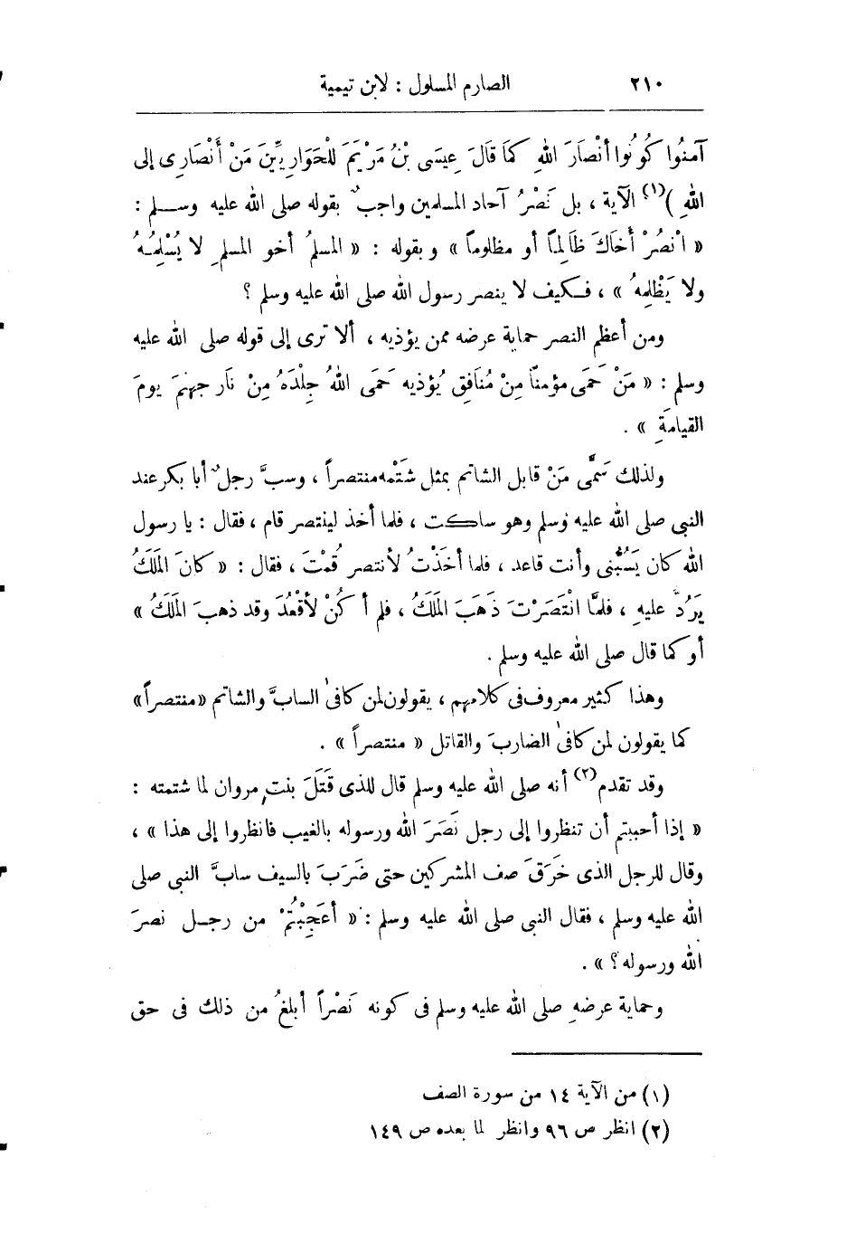 آمَنُوا كُونُوا أَنْصَارَ اللَّهِ كَمَا قَالَ عِيسَى ابْنُ مَرْيَمَ لِلْحَوَارِيِّينَ مَنْ أَنْصَارِي إِلَى اللَّهِ} الآية بل نصر آحاد المسلمين واجب بقوله صلى الله عليه وسلم: "انصر أخاك ظالما أو مظلوما" وبقوله: "المسلم أخو المسلم لا يسلمه ولا يظلمه" فكيف لا ينصر رسول الله صلى الله عليه وسلم؟.