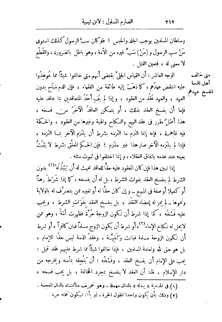 الوجه العاشر: أن القياس الجلي يقتضي أنهم متى خالفوا شيئا مما عوهدوا عليه انتقض عهدهم كما ذهب إليه طائفة من الفقهاء فإن الدم مباح بدون العهد والعهد عقد من العقود وإذا لم يف أحد المتعاقدين بما عاقد عليه فإما أن يفسخ العقد بذلك أو يتمكن العاقد الآخر من فسخه هذا أصل مقرر في عقد البيع والنكاح والهبة وغيرها من العقود والحكمة فيه ظاهرة فإنه إنما التزم ما التزمه بشرط أن يلتزم الآخر بما التزمه فإذا لم يلتزمه الآخر صار هذا غير ملتزم فإن الحكم المعلق بشرط لا يثبت بعينه عند عدمه باتفاق العقلاء وإنما اختلفوا في ثبوت مثله.