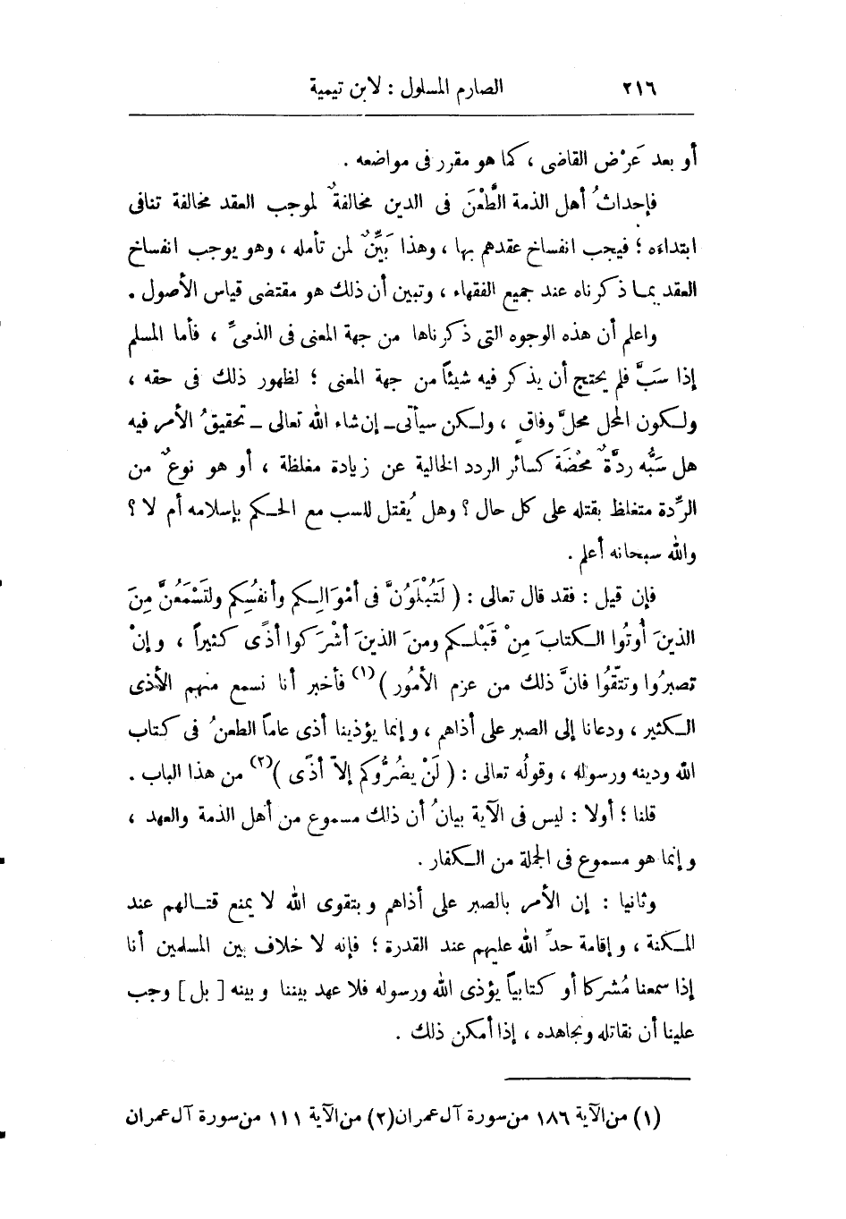 وثانيا: إن الأمر بالصبر على أذاهم وبتقوى الله لا يمنع قتالهم عند المكنة وإقامة حد الله عليهم عند القدرة فإنه لا خلاف بين المسلمين أنا إذا سمعنا مشركا أو كتابيا يؤذي الله ورسوله فلا عهد بيننا وبينه وجب علينا أن نقاتله ونجاهده إذا أمكن ذلك