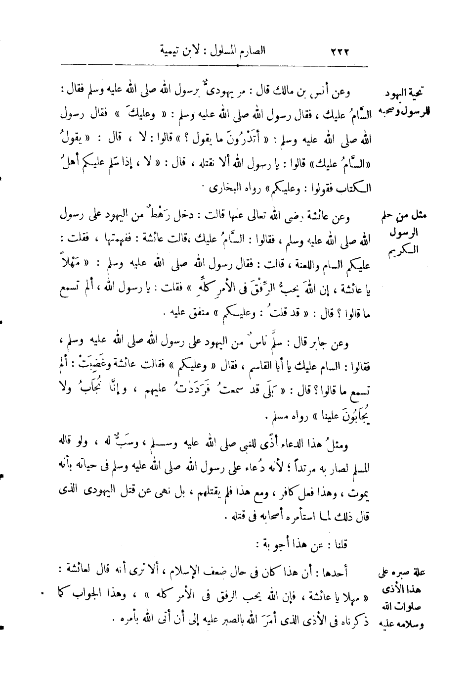وعن جابر قال: " سلم ناس من اليهود على رسول الله صلى الله عليه وسلم فقالوا: السام عليك يا أبا القاسم فقال "وعليكم" فقالت عائشة وغضبت: ألم تسمع ما قالوا؟ قال: "بلى قد سمعت فرددت عليهم وإنا نجاب ولا يجابون علينا " رواه مسلم.
