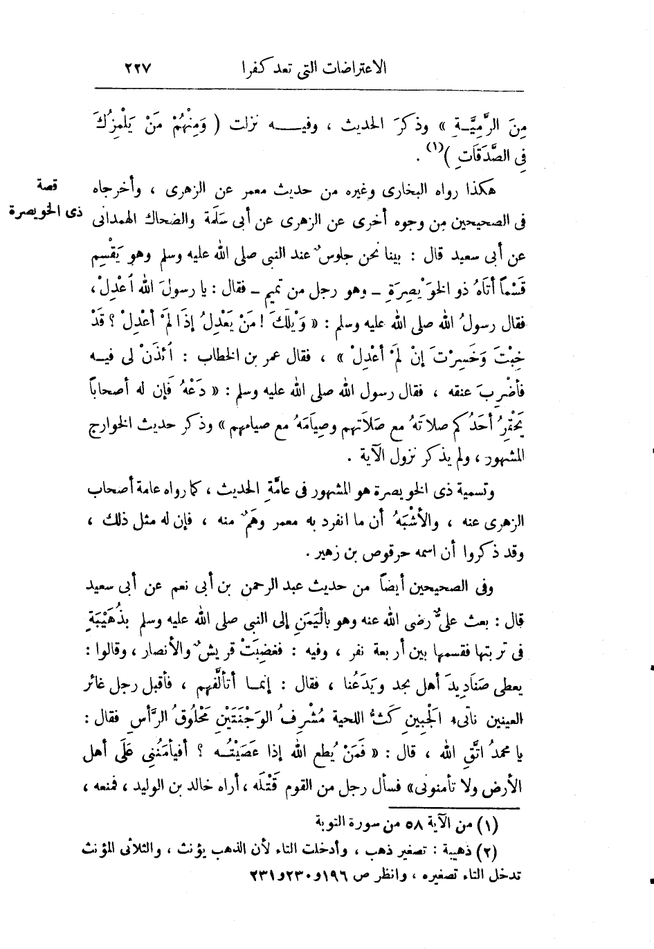 هكذا رواه البخاري وغيره من حديث معمر عن الزهري وأخرجاه في الصحيحين من وجوه أخرى عن الزهري عن أبي سلمة والضحاك الهمداني عن أبي سعيد قال: "بينا نحن جلوس عند النبي صلى الله عليه وسلم وهو يقسم قسما أتاه ذو الخويصرة وهو رجل من بن تميم فقال: يا رسول الله اعدل فقال رسول الله صلى الله عليه وسلم: "ويلك من يعدل إذا لم اعدل؟ قد خبت وخسرت إن لم أعدل " فقال عمر بن الخطاب رضي الله عنه: ائذن لي فيه فأضرب عنقه فقال رسول الله صلى الله عليه وسلم: "دعه فإن له أصحابا يحقر أحدكم صلاته مع صلاتهم وصيامه مع صيامهم " وذكر حديث الخوارج المشهور ولم يذكر نزول الآية.