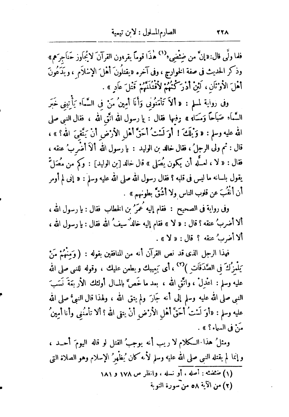 فهذا الرجل قد نص القرآن أنه من المنافقين بقوله: {وَمِنْهُمْ مَنْ يَلْمِزُكَ فِي الصَّدَقَاتِ} أي يعيبك ويطعن عليك وقوله للنبي صلى الله عليه وسلم: اعدل واتق الله بعدما خص بالمال أولئك الأربعة نسب للنبي صلى الله عليه وسلم إلى أنه جار ولم يتق الله ولهذا قال النبي صلى الله عليه وسلم: " أولست أحق أهل الأرض أن يتقي الله ألا تأمنوني وأنا أمين من في السماء؟ ".