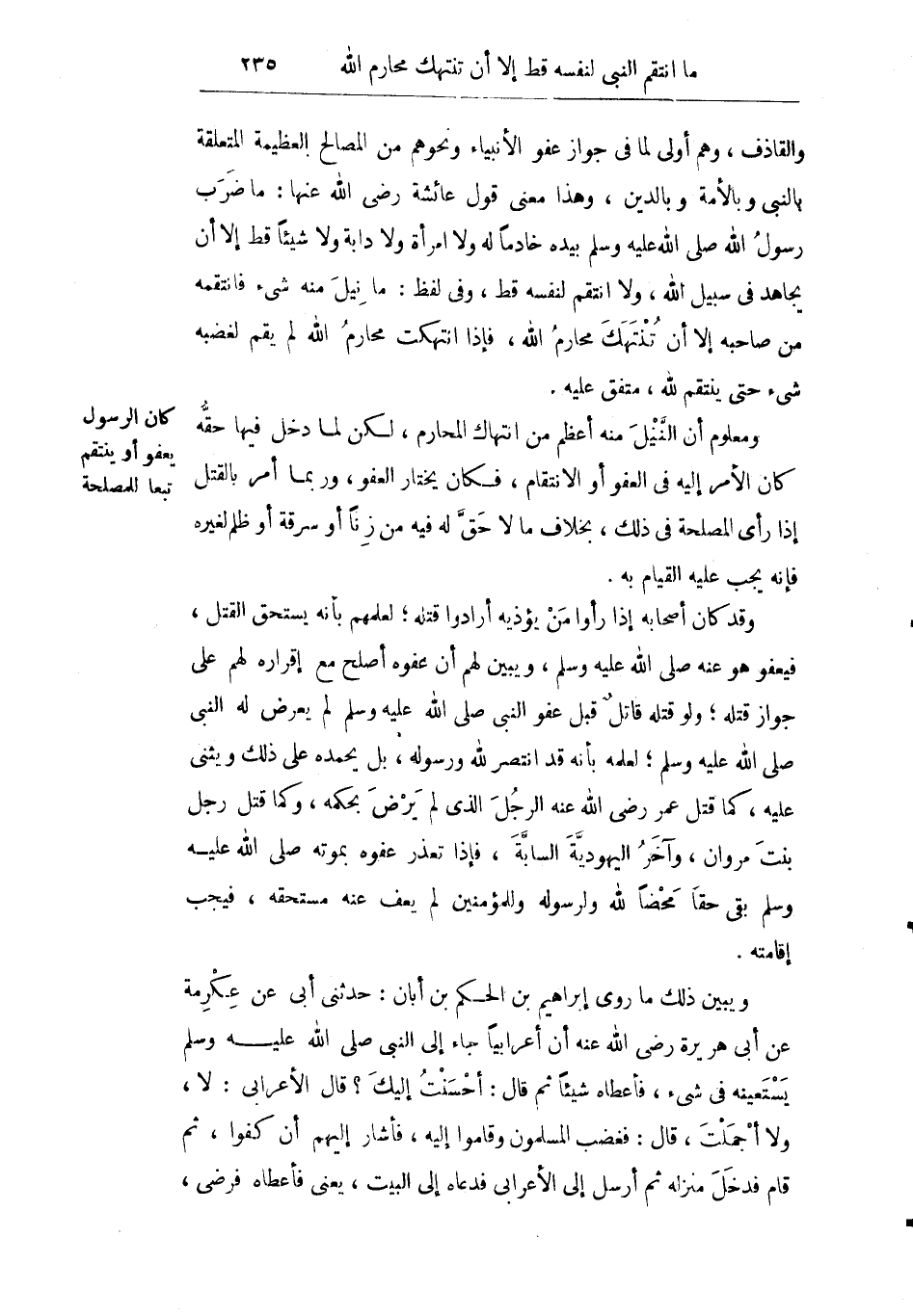ومعلوم أن النيل منه أعظم من انتهاك المحارم لكن لما دخل فيها حقه كان الأمر إليه في العفو أو الانتقام فكان يختار العفو وربما أمر بالقتل إذا رأى المصلحة في ذلك بخلاف ما لا حق له فيه من زنا أو سرقة أو ظلم لغيره فإنه يجب عليه القيام به.