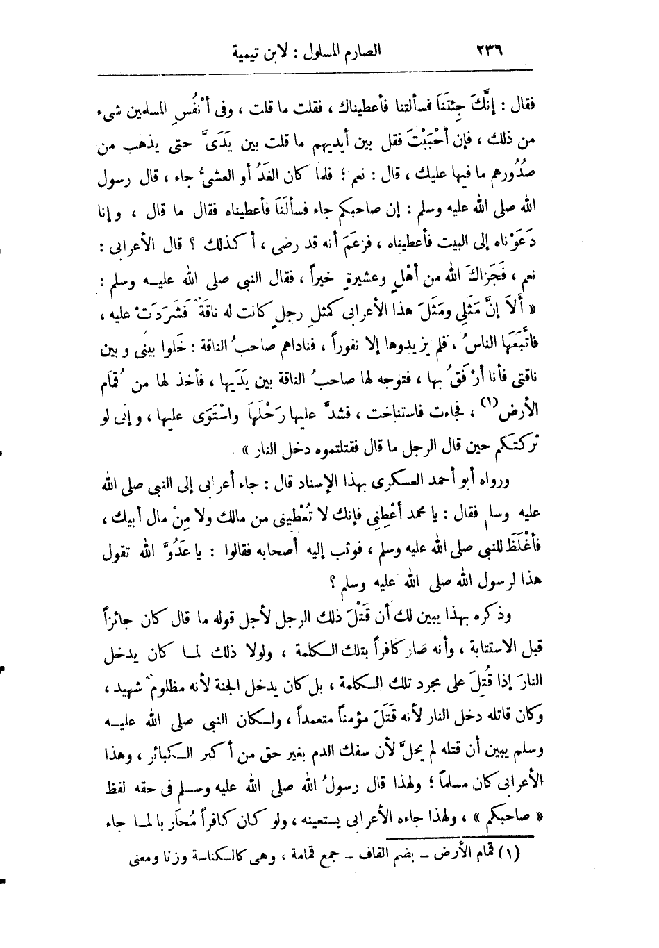 وذكره بهذا يبين لك أن قتل ذلك الرجل لأجل قوله ما قال كان جائزا قبل الاستتابة وأنه صار كافرا بتلك الكلمة ولولا ذلك لما كان يدخل النار إذا قتل على مجرد تلك الكلمة بل كان يدخل الجنة لأنه مظلوم شهيد وكان قاتله دخل النار لأنه قتل مؤمنا متعمدا ولكان النبي صلى الله عليه وسلم يبين أن قتله لم يحل لأن سفك الدم بغير حق من أكبر الكبائر وهذا الأعرابي كان مسلما ولهذا قال صلى الله عليه وسلم في حقه لفظ "صاحبكم" ولهذا جاءه الأعرابي يستعينه ولو كان كافرا محاربا لما جاء