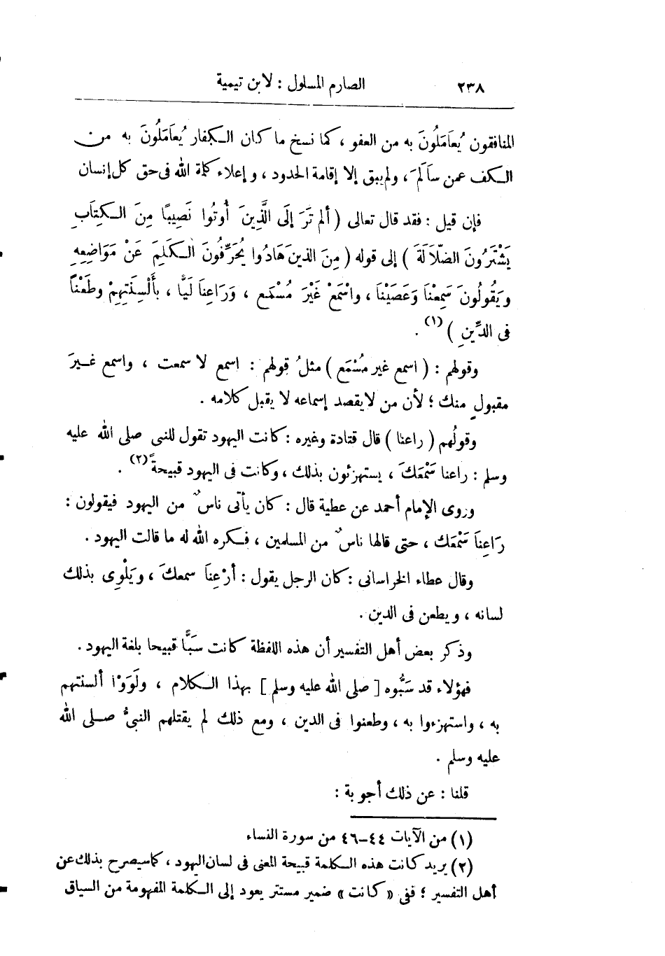 فإن قيل: فقد قال تعالى: {أَلَمْ تَرَ إِلَى الَّذِينَ أُوتُوا نَصِيباً مِنَ الْكِتَابِ يَشْتَرُونَ الضَّلالَة} إلى قوله: {مِنَ الَّذِينَ هَادُوا يُحَرِّفُونَ الْكَلِمَ عَنْ مَوَاضِعِهِ وَيَقُولُونَ سَمِعْنَا وَعَصَيْنَا وَاسْمَعْ غَيْرَ مُسْمَعٍ وَرَاعِنَا لَيّاً بِأَلْسِنَتِهِمْ وَطَعْناً فِي الدِّينِ} .