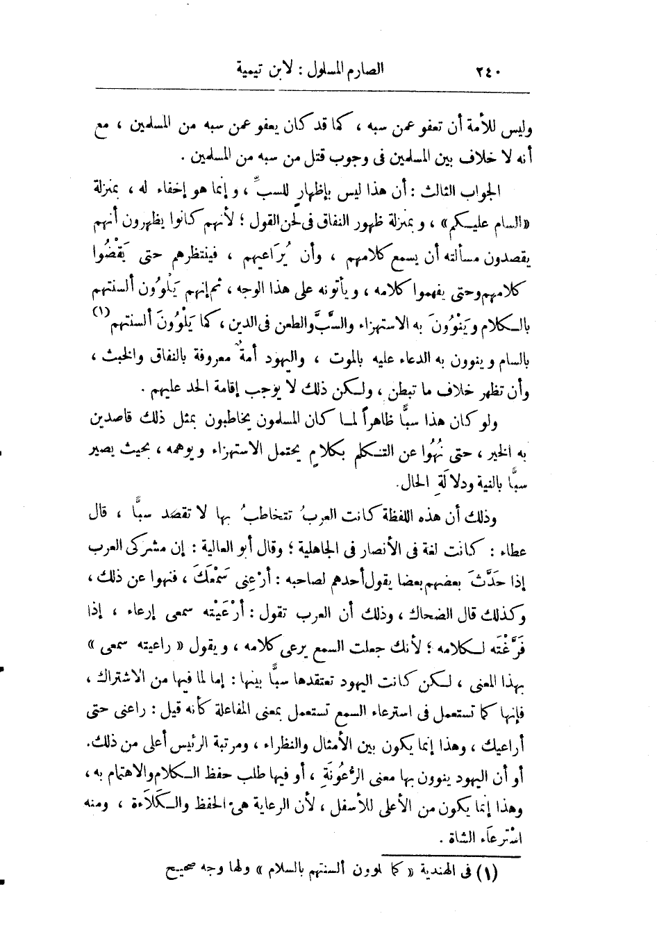 الجواب الثالث: أن هذا ليس بإظهار للسب وإنما هو إخفاء له بمنزلة "السام عليكم" وبمنزلة ظهور النفاق في لحن القول لأنهم كانوا يظهرون أنهم يقصدون مسألته أن يسمع كلامهم وأن يراعيهم فينتظرهم حتى يقضوا كلامهم وحتى يفهموا كلامه ويأتونه على هذا الوجه ثم إنهم يلوون ألسنتهم بالكلام وينوون به الاستهزاء والسب والطعن في الدين كما يلوون ألسنتهم بالسام وينوون به الدعاء عليه بالموت واليهود أمة معروفة بالنفاق والخبث وأن تظهر خلاف ما تبطن ولكن ذلك لا يوجب إقامة الحد عليهم.