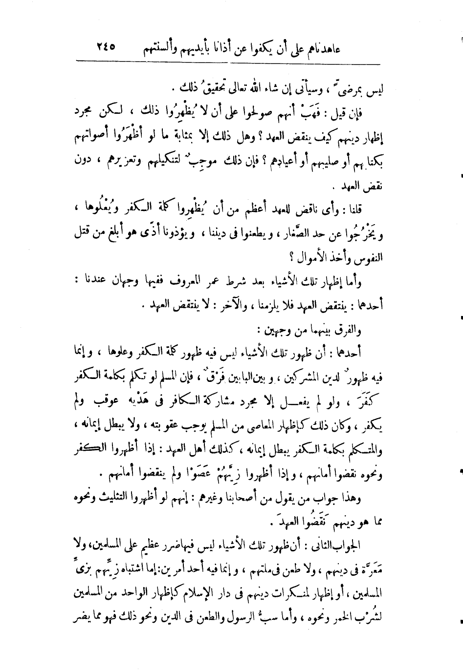 الجواب الثاني: أن ظهور تلك الأشياء ليس فيها ضرر عظيم على المسلمين ولا معرة في دينهم ولا طعن في ملتهم وإنما فيه أحد أمرين: إما اشتباه زيهم بزي المسلمين أو إظهار لمنكرات دينهم في دار الإسلام كإظهار الواحد من المسلمين لشرب الخمر ونحوه وأما سب الرسول والطعن في الدين ونحوه ذلك فهو مما يضر