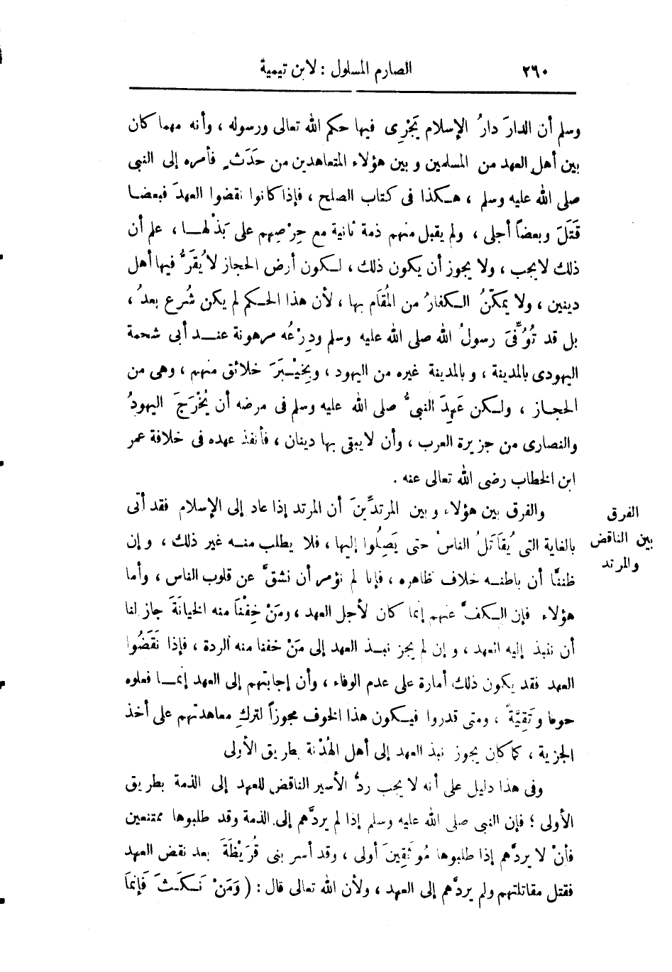 وسلم أن الدار دار الإسلام يجري فيها حكم الله تعالى ورسوله وأنه مهما كان بين أهل العهد من المسلمين ومن هؤلاء المعاهدين من حدث فأمره إلى النبي صلى الله عليه وسلم هكذا في كتاب الصلح فإذا كانوا نقضوا العهد فبعضا قتل وبعضا أجلى ولم يقبل منهم ذمة ثانية مع حرصهم على بذلها علم أن ذلك لا يجب ولا يجوز أن يكون ذلك لكون أرض الحجاز لا يقر فيها أهل دينين ولا يمكن الكفار من المقام بها لأن هذا الحكم لم يكن شرع بعد بل قد توفي رسول الله صلى الله عليه وسلم ودرعه مرهونة عند أبي شحمة اليهودي بالمدينة وبالمدينة غيره من اليهود وبخيبر خلائق منهم وهي من الحجاز ولكن عهد النبي صلى الله عليه وسلم في مرضه أن يخرج اليهود والنصارى من جزيرة العرب وأن لا يبقى بها دينان فأنفذ عهده في خلافة عمر بن الخطاب رضي الله عنه.