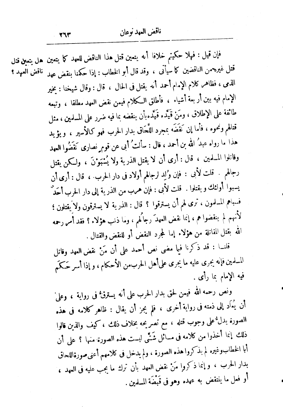 فإن قيل: فهلا حكيتم خلافا أنه يتعين قتل هذا الناقض للعهد كما يتعين قتل غيره من الناقضين كما سيأتي وقد قال أبو الخطاب: إذا حكمنا بنقض عهد الذمي فظاهر كلام الإمام أحمد أنه يقتل في الحال قال: وقال شيخنا: يخير الإمام فيه بين أربعة أشياء فأطلق الكلام فيمن نقض العهد مطلقا وتبعه طائفة على الإطلاق ومن قيده قيده بأن ينقضه بما فيه ضرر على المسلمين مثل قتالهم ونحوه فأما إن نقضه بمجرد اللحاق بدار الحرب فهو كالأسير ويؤيد هذا ما رواه عبد الله بن أحمد قال: سألت أبي عن قوم نصارى نقضوا العهد وقاتلوا المسلمين قال: "أرى أن لا يقتل الذرية ولا يسبون ولكن يقتل رجالهم" قلت لأبي: فإن ولد لرجالهم أولاد في دار الحرب قال: "أرى أن يسبوا أولئك ويقتلوا" قلت لأبي: فإن هرب من الذرية إلى دار الحرب أحد فسباهم المسلمون ترى لهم أن يسترقوا؟ قال: "الذرية لا يسترقون ولا يقتلون لأنهم لم ينقضوا هم إنما نقض العهد رجالهم وما ذنب هؤلاء؟ " فقد أمر رحمه الله بقتل المقاتلة من هؤلاء إما لمجرد النقض أو للنقض والقتال.
