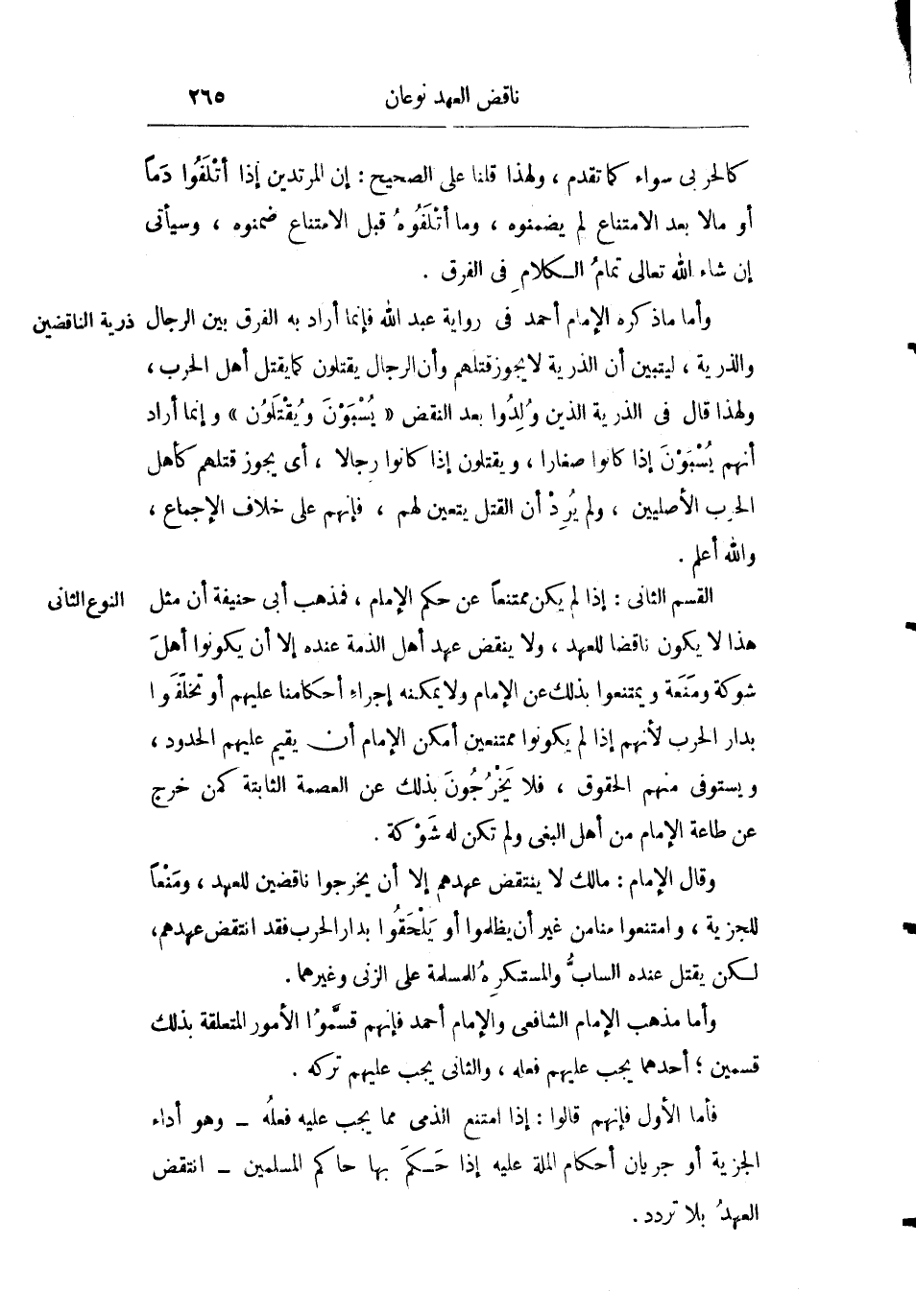 القسم الثاني: إذا لم يكن ممتنعا عن حكم الإمام فمذهب أبي حنيفة أن مثل هذا لا يكون ناقضا للعهد ولا ينقض عهد أهل الذمة عنده إلا أن يكونوا أهل شوكة ومنعة فيمتنعوا بذلك على الإمام ولا يمكنه إجراء أحكامنا عليهم أو تخلفوا بدار الحرب لأنهم إذا لم يكونوا ممتنعين أمكن الإمام أن يقيم عليهم الحدود ويستوفي منهم الحقوق فلا يخرجون بذلك عن العصمة الثابتة كمن خرج عن طاعة الإمام من أهل البغي ولم تكن له شوكة.