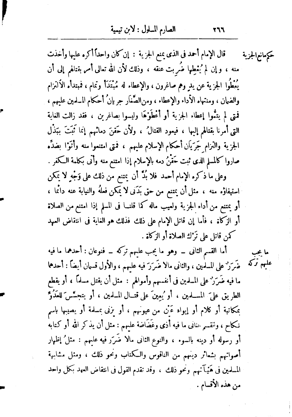 وعلى ما ذكره الإمام أحمد فلا بد أن يمتنع من ذلك على وجه لا يمكن استيفاؤه منه مثل أن يمتنع من حق بدني لا يمكن فعله ونيابة عنه دائما أو يمتنع من أداء الجزية ولعيب ماله كما قلنا في المسلم إذا امتنع من الصلاة أو الزكاة فأما إن قاتل الإمام على ذلك فذلك هو الغاية في انتقاض العهد كمن قاتل على ترك الصلاة أو الزكاة.