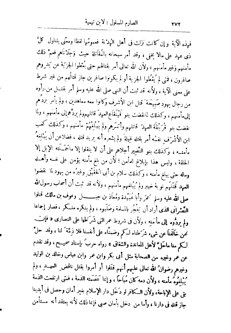 فهذه الآية وإن كانت نزلت في أهل الهدنة فعمومها لفظا ومعنى يتناول كل ذي عهد على ما لا يخفى وقد أمر سبحانه بالمقاتلة حيث وجدناهم فعم ذلك مأمنهم وغير مأمنهم ولأن الله تعالى أمر بقتالهم حتى يعطوا الجزية عن يد وهم صاغرون فمتى لم يعطوا الجزية أو لم يكونوا صاغرين جاز قتالهم من غير شرط على معنى الآية ولأنه قد ثبت أن النبي صلى الله عليه وسلم أمر بقتل من رأوه من رجال يهود صبيحة قتل ابن الأشرف وكانوا معه معاهدين ولم يأمر بردهم إلى مأمنهم وكذلك لما نقضت بنو قينقاع العهد قاتلهم ولم يردهم إلى مأمنهم ولما نقضت بنو قريظة العهد قاتلهم وأسرهم ولم يبلغهم مأمنهم وكذلك كعب بن الأشرف نفسه أمر بقتله غيلة ولم يشعره أنه يريد قتله فضلا عن أن يبلغه مأمنه وكذلك بنو النضير أجلاهم على أن لا ينقلوا إلا ما حملته الإبل إلا الحلقة وليس هذا بإبلاغ للمأمن لأن من بلغ مأمنه يؤمن على نفسه وأهله وماله حتى يبلغ مأمنه وكذلك سلام ابن أبي الحقيق وغيره من يهود لما نقضوا العهد قتلهم نوبة خبير ولم يبلغهم مأمنهم ولأنه قد ثبت أن أصحاب رسول الله صلى الله عليه وسلم عمر وأبا عبيدة ومعاذ ابن جبل وعوف بن مالك قتلوا النصراني الذي أراد أن يفجر بالمسلمة وصلبوه ولم ينكره منكر فصار إجماعا ولم يردوه إلى مأمنه ولأن في شروط عمر التي شرطها على النصارى "فإن نحن خالفا عن شيء شرطناه لكم وضمناه على أنفسنا فلا ذمة لنا وقد حل لكم منا ما حل لأهل المعاندة والشقاق" رواه حرب بإسناد صحيح وقد تقدم عن عمر وغيره من الصحابة مثل أبي بكر وعمر وابن عباس وخالد بن الوليد وغيرهم رضوان الله عليهم أنهم قتلوا وأمروا بقتل ناقض العهد ولم يبلغوه مأمنه ولئن دمه كان مباحا وإن عصمته الذمة فمتى ارتفعت الذمة بقي على الإباحة ولأن الكافر لو دخل دار الإسلام بغير أمان وحصل في أيدينا جاز قتله في دارنا وأما من دخل بأمان صبى فإنما ذاك لأنه يعتقد أنه مستأمن