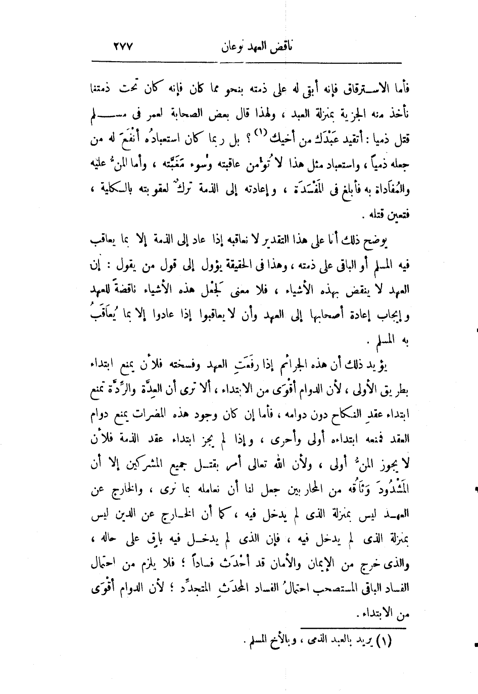ويؤيد ذلك أن هذه الجرائم إذا رفعت العهد وفسخته فلأن يمنع ابتداء بطريق الأولى لأن الدوام أقوى من الابتداء ألا ترى أن العدة والردة تمنع ابتداء عقد النكاح دون دوامه فأما إن كان وجود هذه المضرات يمنع دوام العقد فمنعه ابتداءه أولى وأحرى وإذا لم يجز ابتداء عقد الذمة فلأن لا يجوز المن عليه أولى ولأن الله تعالى أمر بقتل جميع المشركين إلا أن المشدود وثاقه من المحاربين جعل لنا أن نعامله بما نرى والخارج عن العهد وليس بمنزلة الذي لم يدخل فيه كما أن الخارج عن الدين ليس بمنزلة الذي لم يدخل فيه فإن الذي لم يدخل فيه باق على حاله والذي خرج من الإيمان والأمان قد أحدث فسادا فلا يلزم من احتمال الفساد الباقي المستصحب احتمال الفساد المحدث المتجدد لأن الدوام أقوى من الابتداء.