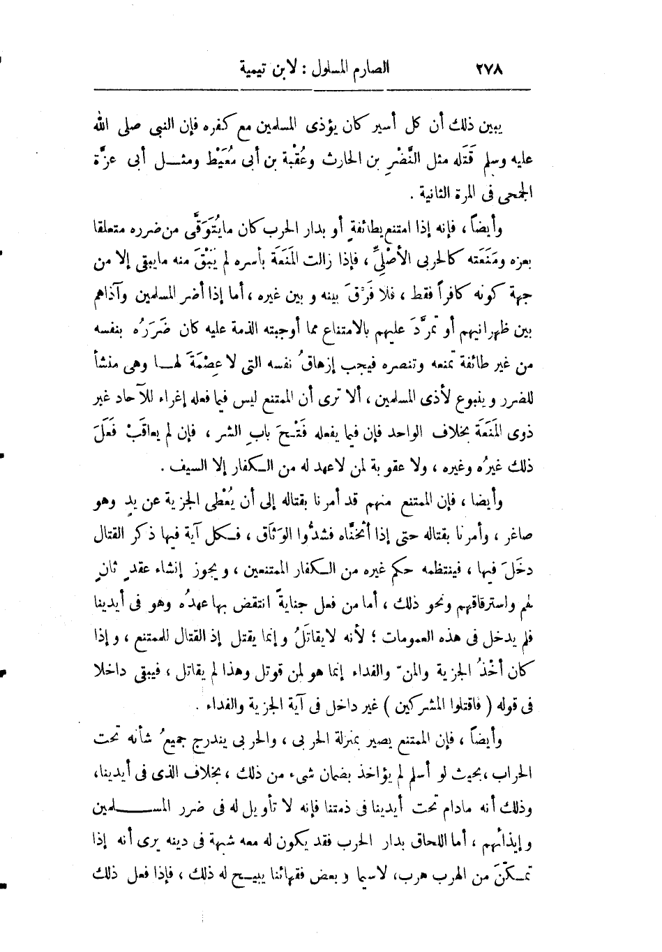 وأيضا فإن الممتنع منهم قد أمرنا بقتاله إلى أن يعطي الجزية عن يد وهو صاغر وأمرنا بقتاله حتى إذا أثخناه فشدوا الوثاق فكل آية فيها ذكر القتال دخل فيها فينتظمه حكم غيره من الكفار الممتنعين ويجوز إنشاء عقد ثان لهم واسترقاقهم ونحو ذلك أما من فعل جناية انتقض بها عهده وهو في أيدينا فلم يدخل في هذه العمومات لأنه لا يقاتل وإنما يقتل إذ القتال للممتنع وإذا كان أخذ الجزية والمن والفداء إنما هو لمن قوتل هذا لم يقاتل فيبقى داخلا في قوله: {فَاقْتُلُوا الْمُشْرِكِينَ} غير داخل في آية الجزية والفداء.