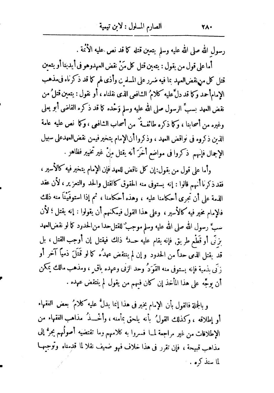 أما على قول من يقول: يتعين قتل كل من نقض العهد وهو في أيدينا أو يتعين قتل كل من نقض العهد بما فيه ضرر على المسلمين وأذى لهم كما ذكرناه في مذهب الإمام أحمد وكما قد دل عليه كلام الشافعي الذي نقلناه أو نقول: يتعين قتل من نقض العهد بسب الرسول صلى الله عليه وسلم وحده كما قد ذكره القاضي أبو يعلي وغيره من أصحابنا وكما ذكره طائفة من أصحاب الشافعي وكما نص عليه عامة الذين ذكروه في نواقض العهد وذكروا أن الإمام يتخير فيمن نقض العهد على سبيل الإجمال فإنهم ذكروا في مواضع أخر أنه يقتل من غير تخيير فظاهر.