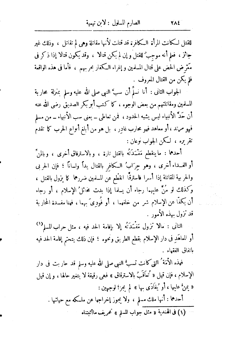 الجواب الثاني: أنا نسلم أن سب النبي صلى الله عليه وسلم بمنزلة محاربة المسلمين ومقاتلهم من بعض الوجوه كما كتب أبو بكر الصديق رضي الله عنه أن حد الأنبياء ليس يشبه الحدود فمن تعاطى ذلك يعني سب الأنبياء من مسلم فهو مرتد أو معاهد فهو محارب غادر بل هو من أبلغ أنواع الحراب كما تقدم تقريره لكن الجواب نوعان: