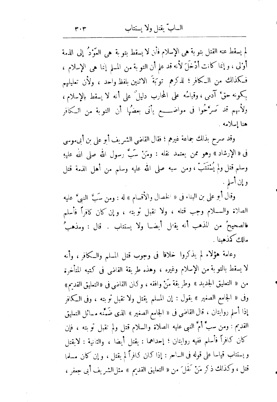 وقد صرح بذلك جماعة غيرهم فقال القاضي الشريف أبو علي بن أبي موسى في "الإرشاد" وهو ممن يعتمد نقله: "ومن سب رسول الله صلى الله عليه وسلم قتل ولم يستتب ومن سبه صلى الله عليه وسلم من أهل الذمة قتل وإن أسلم".