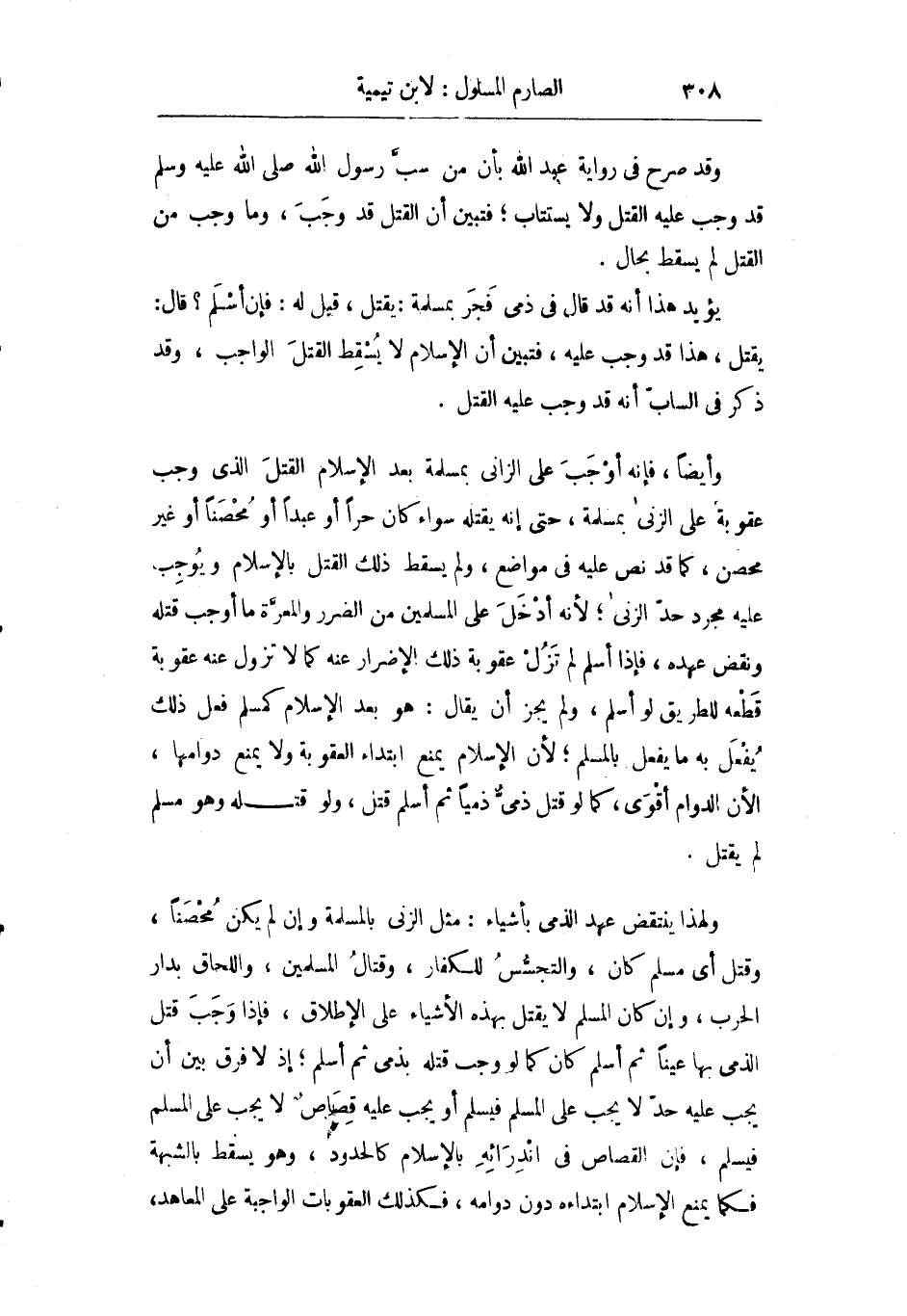 وأيضا فإنه أوجب على الزاني بمسلمة بعد الإسلام القتل الذي وجب عقوبة على الزنى بمسلمة حتى إنه يقتله سواء كان حرا أو عبدا أو محصنا أو غير محصن كما قد نص عليه في مواضع ولم يسقط ذلك القتل بالإسلام ويوجب عليه مجرد حد الزنا لأنه أدخل على المسلمين من الضرر والمعرة ما أوجب قتله ونقض عهده فإذا أسلم لم تزل عقوبة ذلك الإضرار عنه كما لا تزول عنه عقوبة قطعه للطريق لو أسلم ولم يجز أن يقال: هو بعد الإسلام كمسلم فعل ذلك يفعل به ما يفعل بالمسلم لأن الإسلام يمنع ابتداء العقوبة ولا يمنع دوامها لأن الدوام أقوى كما لو قتل ذمي ذميا ثم أسلم قتل ولو قتله وهو مسلم لم يقتل.