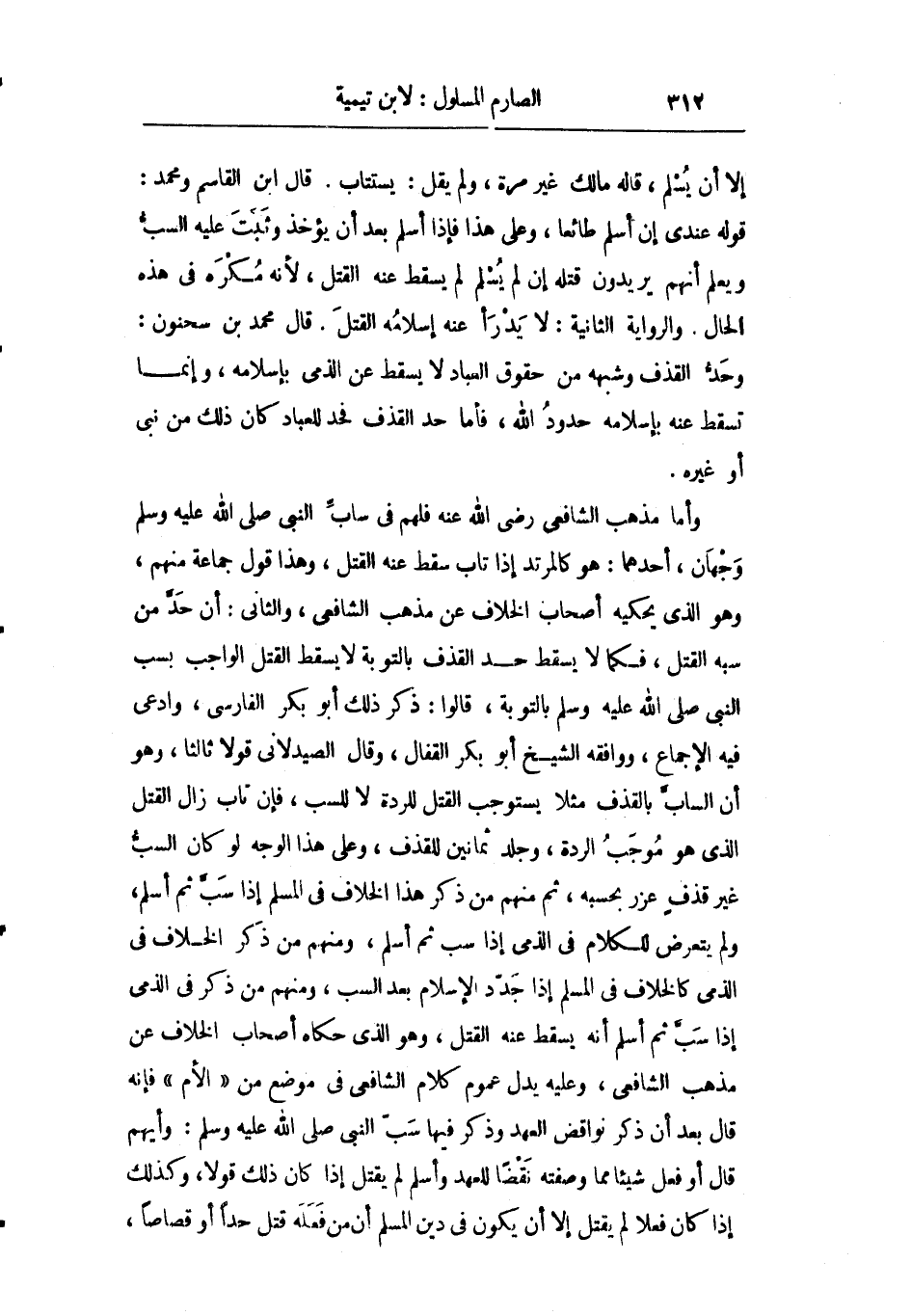 إلا أن يسلم قاله مالك غير مرة ولم يقل: يستتاب قال ابن القاسم ومحمد: قوله عندي إن أسلم طائعا وعلى هذا فإذا أسلم بعد أن يؤخذ وثبت عليه السب ويعلم أنهم يريدون قتله إن لم يسلم لم يسقط عنه القتل لأنه مكره في هذه الحال والرواية الثانية: لا يدرأ عنه إسلامه القتل قال محمد بن سحنون: وحد القذف وشبهه من حقوق العباد لا يسقط عن الذمي بإسلامه وإنما تسقط عنه بإسلامه حدود الله فأما حد القذف فحد للعباد كان ذلك من نبي أو غيره.