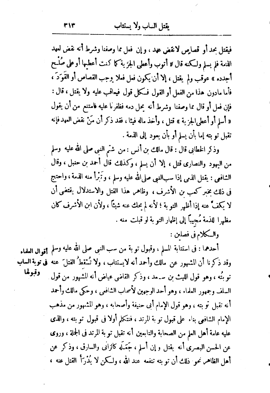 أحدهما: في استتابة المسلم وقبول توبة من سب النبي صلى الله عليه وسلم وقد ذكرنا أن المشهور عن مالك وأحمد أنه لا يستتاب ولا تسقط القتل عنه توبته وهو قول الليث بن سعد وذكر القاضي عياض أنه المشهور من قول السلف وجمهور العلماء وهو أحد الوجهين لأصحاب الشافعي وحكى مالك وأحمد أنه تقبل توبته وهو قول أبي حنيفة وأصحابه وهو المشهور من مذهب الشافعي بناء على قبول توبة المرتد فنتكلم أولا في قبول توبته والذي عليه عامة أهل العلم من الصحابة والتابعين أنه تقبل توبة المرتد في الجملة وروي عن الحسن البصري أنه يقتل وإن أسلم جعله كالزاني والسارق وذكر عن أهل الظاهر نحو ذلك أن توبته تنفعه عند الله ولكن لا يدرأ القتل عنه