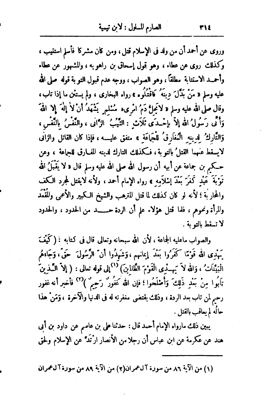 والصواب ما عليه الجماعة لأن الله سبحانه وتعالى قال في كتابه: {كَيْفَ يَهْدِي اللَّهُ قَوْماً كَفَرُوا بَعْدَ إِيمَانِهِمْ وَشَهِدُوا أَنَّ الرَّسُولَ حَقٌّ وَجَاءَهُمُ الْبَيِّنَاتُ وَاللَّهُ لا يَهْدِي الْقَوْمَ الظَّالِمِينَ} إلى قوله تعالى: {إِلاَّ الَّذِينَ تَابُوا مِنْ بَعْدِ ذَلِكَ وَأَصْلَحُوا فَإِنَّ اللَّهَ غَفُورٌ رَحِيمٌ} فأخبر الله أنه غفور رحيم لمن تاب بعد الردة وذلك يقتضى مغفرته له في الدنيا والآخرة ومن هذه حاله لم يعاقب بالقتل.
