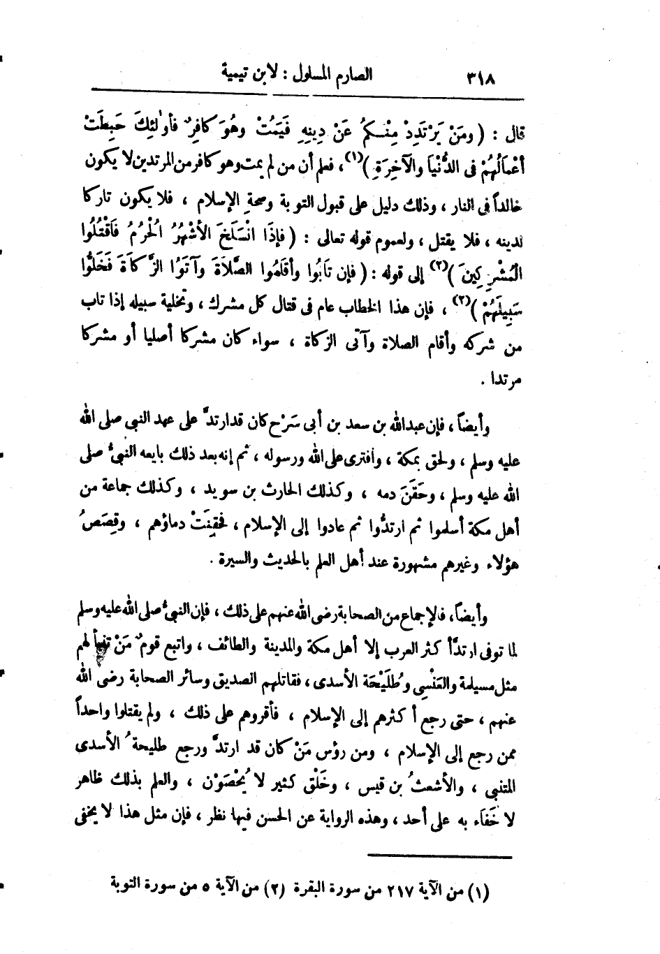 قال: {وَمَنْ يَرْتَدِدْ مِنْكُمْ عَنْ دِينِهِ فَيَمُتْ وَهُوَ كَافِرٌ فَأُولَئِكَ حَبِطَتْ أَعْمَالُهُمْ فِي الدُّنْيَا وَالآخِرَة} فعلم أن من لم يمت وهو كافر من المرتدين لا يكون خالدا في النار وذلك دليل على قبول التوبة وصحة الإسلام فلا يكون تاركا لدينه فلا يقتل ولعموم قوله تعالى: {فَإِذَا انْسَلَخَ الأَشْهُرُ الْحُرُمُ فَاقْتُلُوا الْمُشْرِكِينَ} إلى قوله: {فَإِنْ تَابُوا وَأَقَامُوا الصَّلاةَ وَآتَوُا الزَّكَاةَ فَخَلُّوا سَبِيلَهُمْ} فإن هذا الخطاب عام في قتال كل مشرك وتخلية سبيله إذا تاب من شركه وأقام الصلاة وآتى الزكاة سواء كان مشركا أصليا أو مشركا مرتدا.