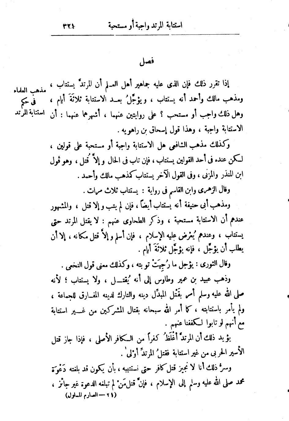 إذا تقرر ذلك فإن الذي عليه جماهير أهل العلم أن المرتد يستتاب ومذهب مالك وأحمد أنه يستتاب ويؤجل بعد الاستتابة ثلاثة أيام وهل ذلك واجب أو مستحب؟ على روايتين عنهما أشهرهما عنهما: أن الاستتابة واجبة وهو قول إسحاق بن راهويه.