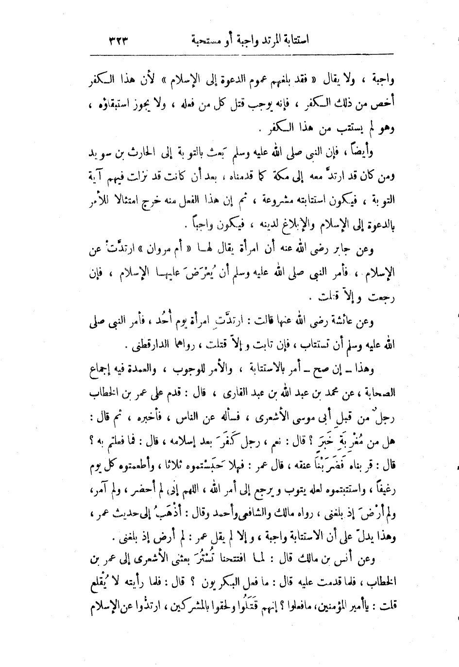 وهذا إن صح أمر بالاستتابة والأمر للوجوب والعمدة فيه إجماع الصحابة عن محمد بن عبد الله بن عبد القاري قال: "قدم على عمر بن الخطاب رجل من قبل أبي موسى الأشعري فسأله عن الناس فأخبره ثم قال: هل من مغربة خبر؟ قال: نعم رجل كفر بعد إسلامه قال: فما فعلتم به؟ قال: قربناه فضربنا عنقه قال عمر: فهلا حبستموه ثلاثا وأطعمتوه كل يوم رغيفا واستتبتموه لعله يتوب ويرجع إلى أمر الله اللهم إني لم أحضر ولم آمر ولم أرض إذ بلغني" رواه مالك والشافعي وأحمد وقال: أذهب إلى حديث عمر وهذا يدل على أن الاستتابة واجبة وإلا لم يقل عمر: "لم أرض إذ بلغني".